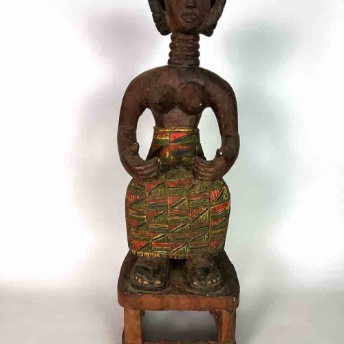 One of the strongest faiths of the African people is reincarnation. The word reincarnate also implies a constant cycle of life. Therefore infertility is considered a detrimental curse, as it stops the cycle of rebirth. To ensure healthy pregnancy, birth, and life, the Ashanti people employ spiritual aids of mothers and children. The Ashanti – aka Asante – the largest tribe in the Akan group inhabiting a large area of Ghana and Ivory Coast, believe the greatest role of a woman is to become pregnant, give birth and raise the children. Thus this figure is made to ensure the prosperity of the cycle of life. This statue measures:10 1/2 x 10 x 33 1/2″ (27 x 25 x 85 cm)