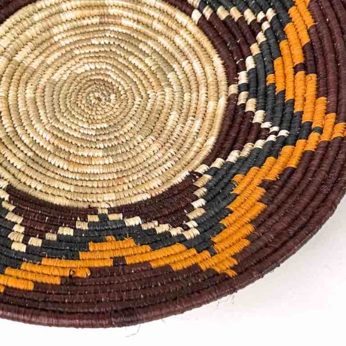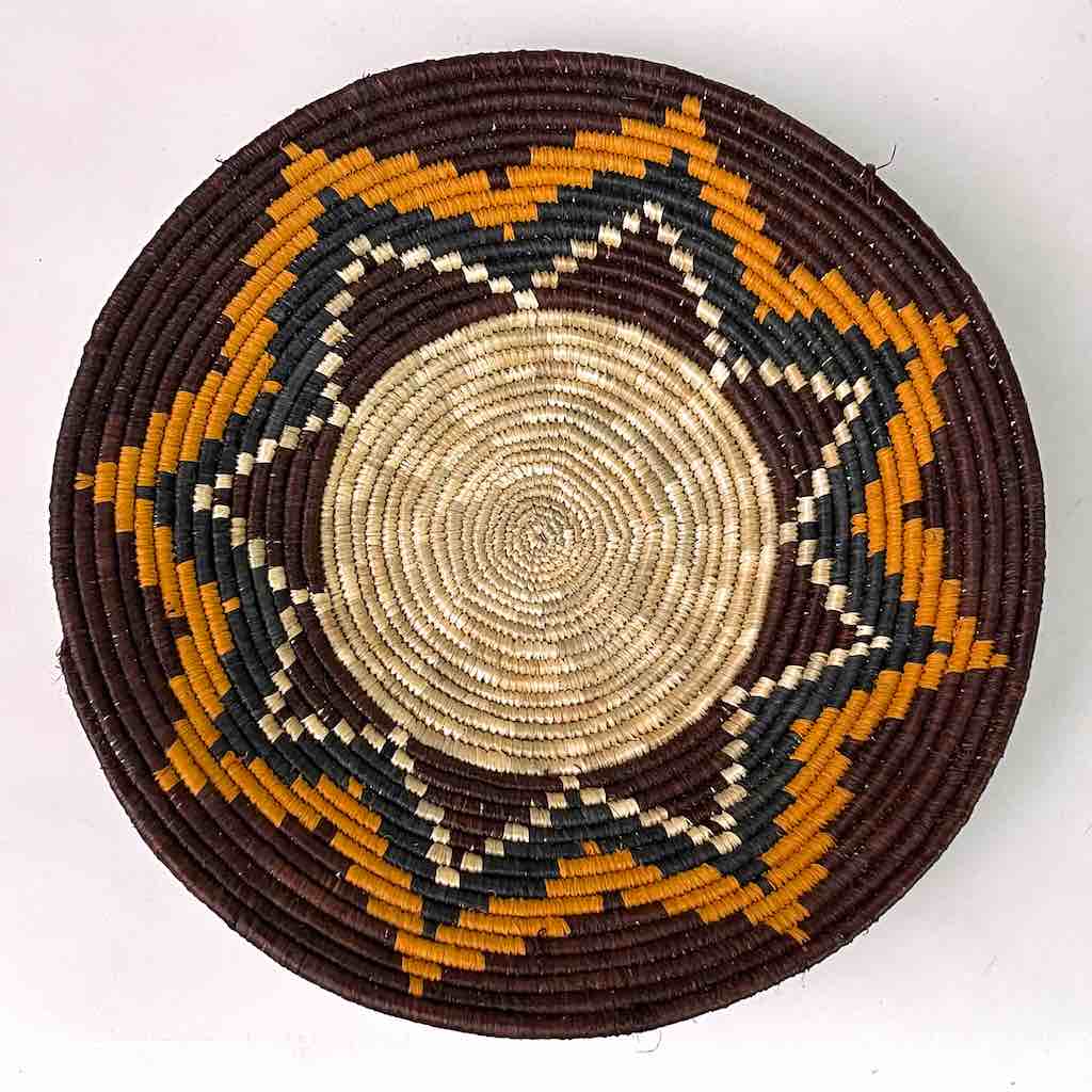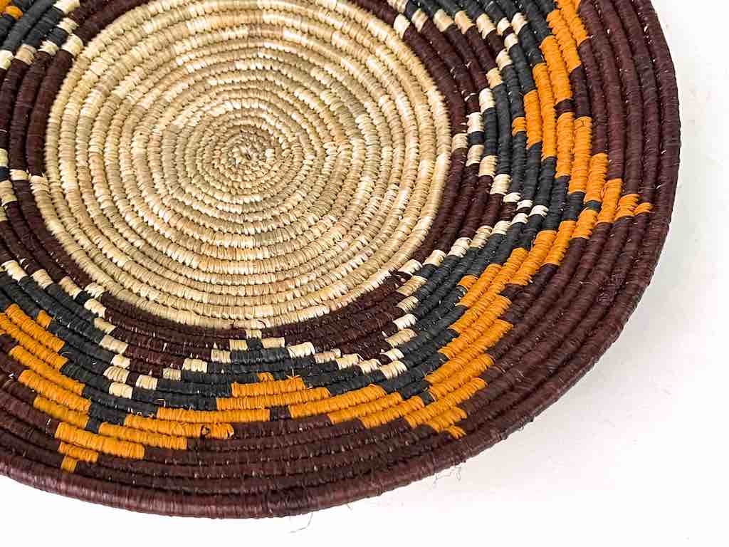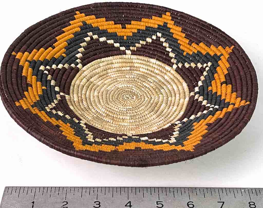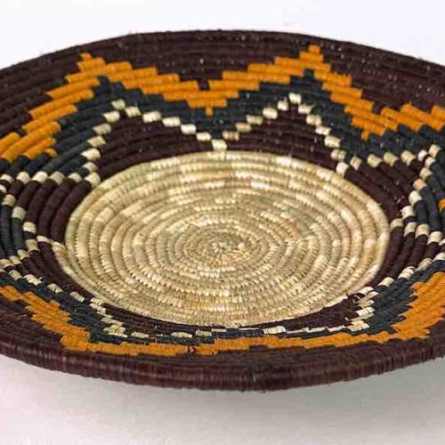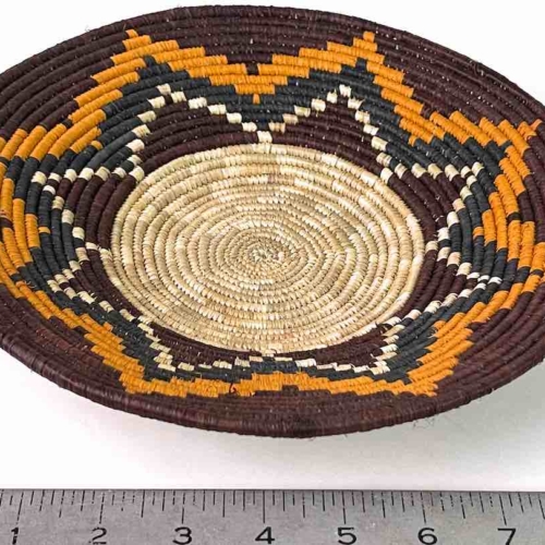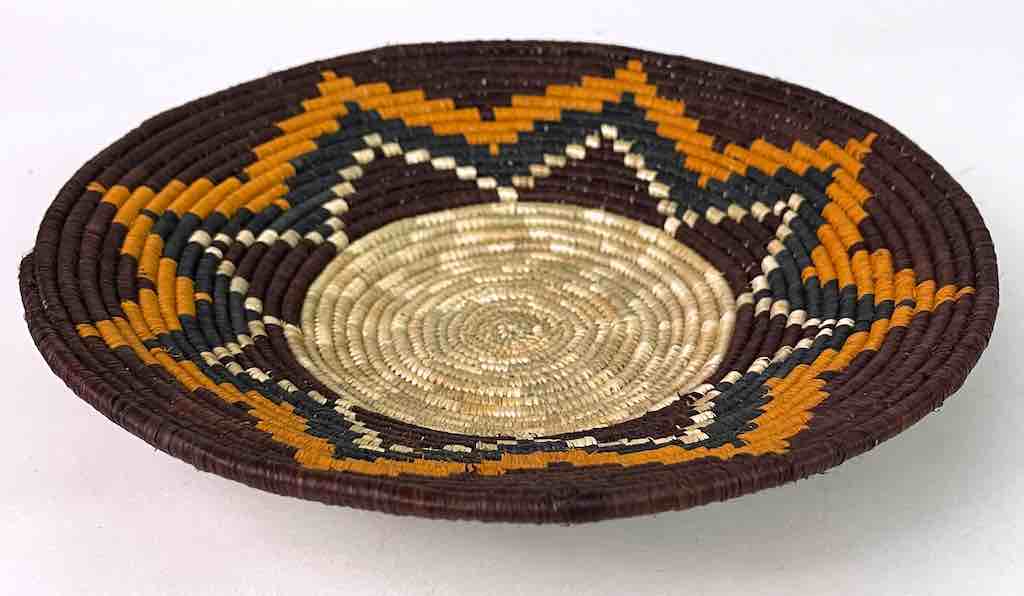 This basket/bowl is one of the thinnest coil and therefore finest quality woven basket in Africa. The design is among the most intricate, demonstrating the very advanced skill of the women who make these in Uganda, near the Ruwenzori Mountains. This one is relatively small which affords the woman who made it to show off her exceptional basket weaving ability at a lower cost. We think these are the most beautiful and finest quality baskets we have ever seen, reflecting the unbelievable ingenuity of these amazing Ugandan artisans. Locally available natural dyes are used to create the vibrant colors which contribute to the beauty of these baskets This basket measures 9 5/8″ in diameter x 1 3/4″ deep.