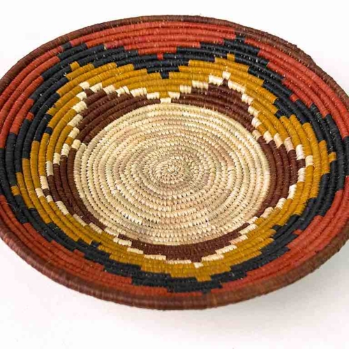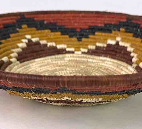 This basket/bowl is one of the thinnest coil and therefore finest quality woven basket in Africa. The design is among the most intricate, demonstrating the very advanced skill of the women who make these in Uganda, near the Ruwenzori Mountains. This one is relatively small which affords the woman who made it to show off her exceptional basket weaving ability at a lower cost. We think these are the most beautiful and finest quality baskets we have ever seen, reflecting the unbelievable ingenuity of these amazing Ugandan artisans. Locally available natural dyes are used to create the vibrant colors which contribute to the beauty of these baskets This basket measures 7 3/4″ in diameter x 1 1/2″ deep.