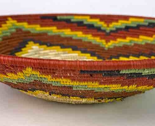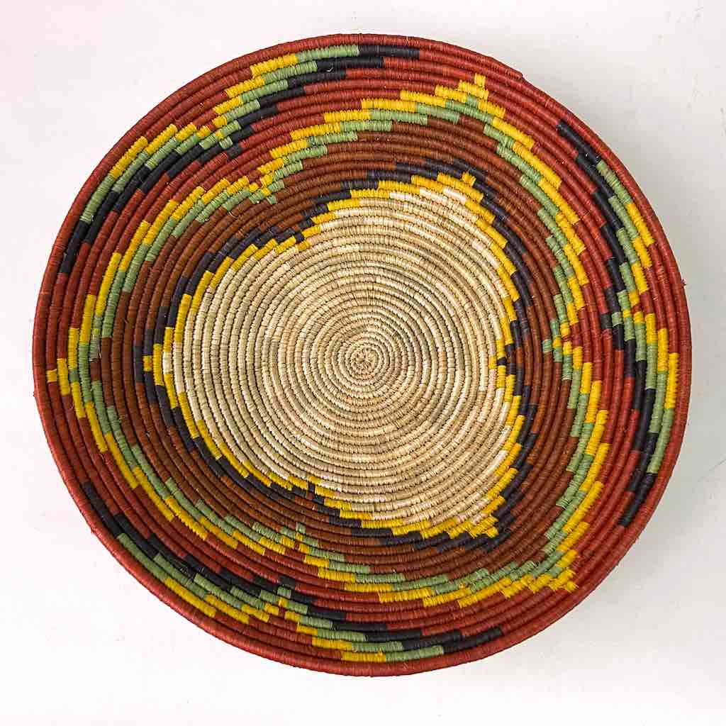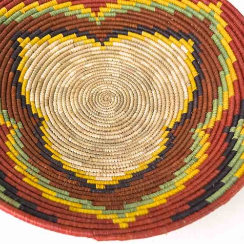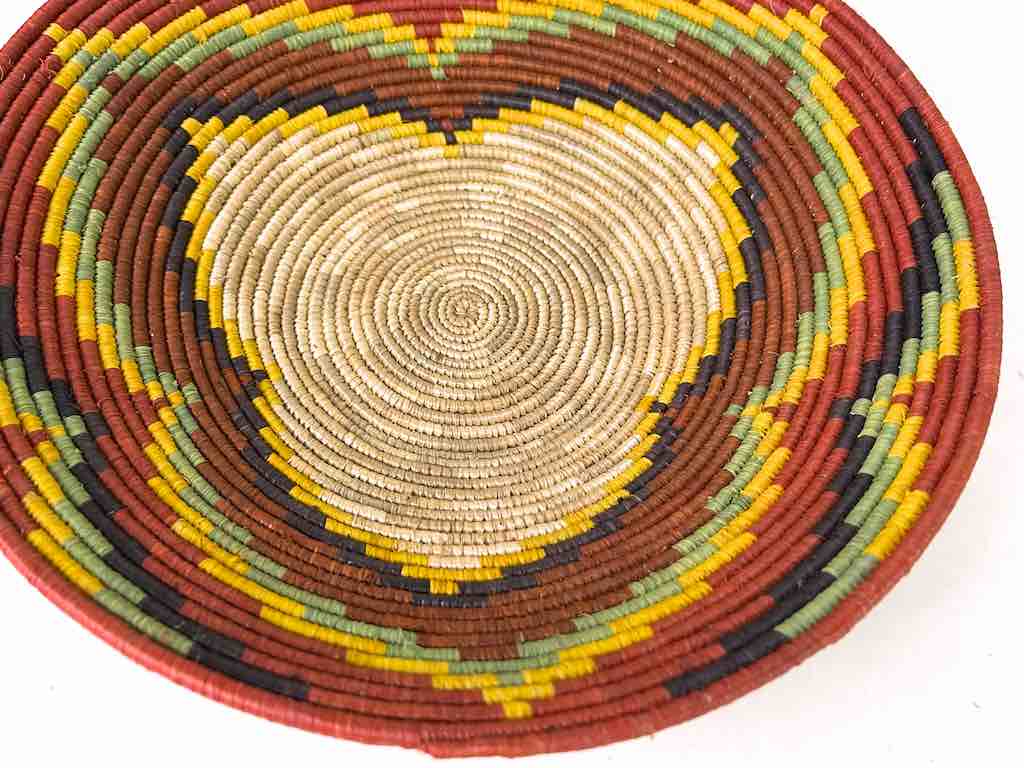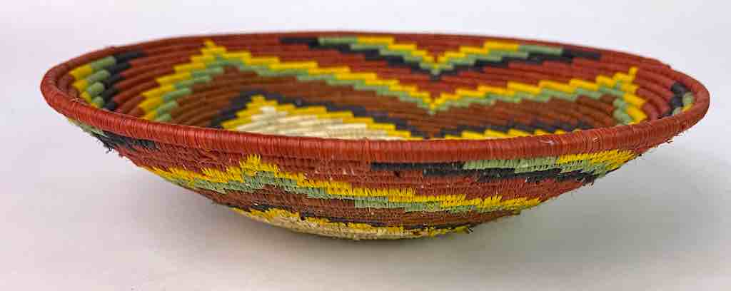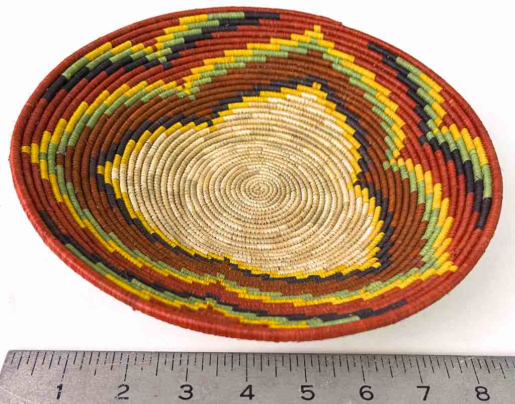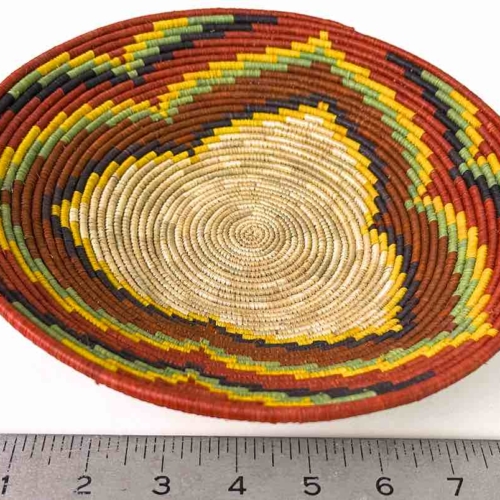 This basket/bowl is one of the thinnest coil and therefore finest quality woven basket in Africa. The design is among the most intricate, demonstrating the very advanced skill of the women who make these in Uganda, near the Ruwenzori Mountains. This one is relatively small which affords the woman who made it to show off her exceptional basket weaving ability at a lower cost. We think these are the most beautiful and finest quality baskets we have ever seen, reflecting the unbelievable ingenuity of these amazing Ugandan artisans. Locally available natural dyes are used to create the vibrant colors which contribute to the beauty of these baskets This basket measures 9 1/8″ in diameter x 1 3/4″ deep.