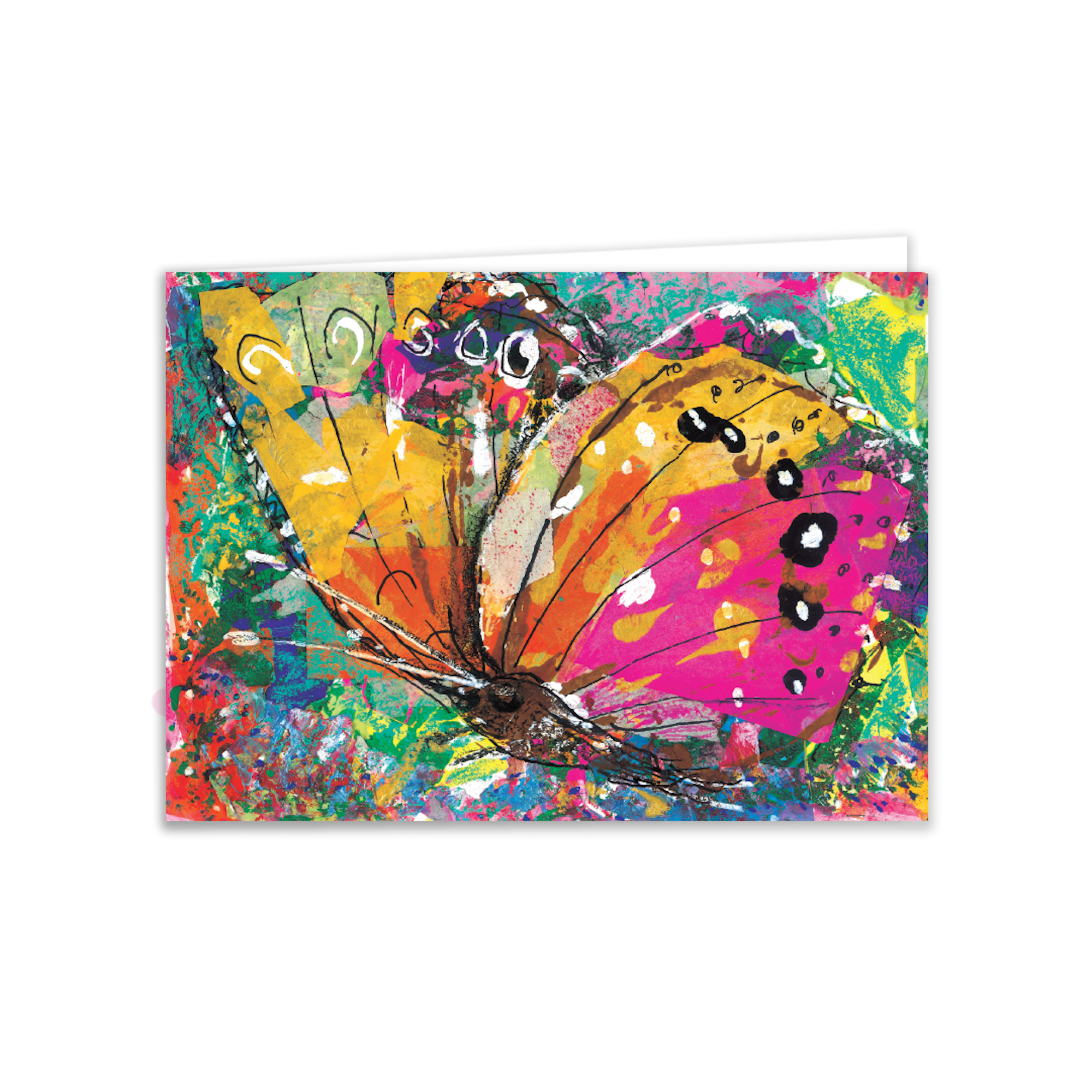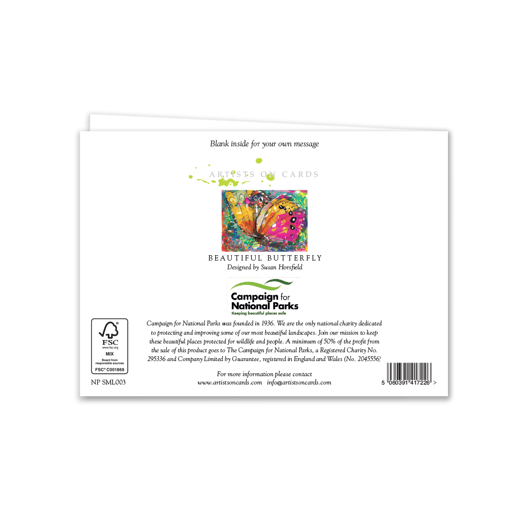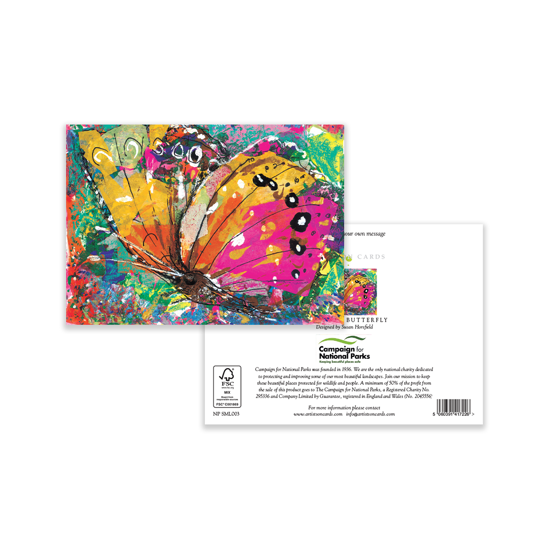 A vivid butterfly in hot pinks, oranges and tropical greens, layered with expressive brushwork and print textures. Joyful, contemporary, and eye-catching on shelf; an easy pick-up for birthdays, congratulations and general well-wishing. Original studio artwork by Susan Horsfield.