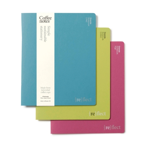 Pack of three sustainable notebooks made from {re}cycled coffee cup paper and a mixture of {re}cycled and FSC fibres. Do you love your notebooks plain, lined or dotted? Malva (plain), Azzuro (lined), Pistachio (dotted)