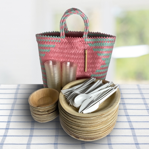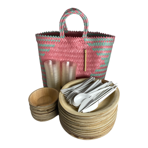 Our eco-friendly dinnerware set gives you a high quality, durable feel while providing a guilt-free disposable solution. The biodegradable plates and compostable cutlery offer reliable strength which holds their shape, prevent leaks and impart no flavour. It consists in a 150 pieces pack of 50 round palm leaf plates (25u of 24cm, 25u of 13cm), 25 compostable drinking glasses, 25 compostable cutlery set (knife, fork and spoon), and an attractive eco-friendly bag (30x16x30cm). Plenty to serve an intimate gathering or small party of close friends and family.