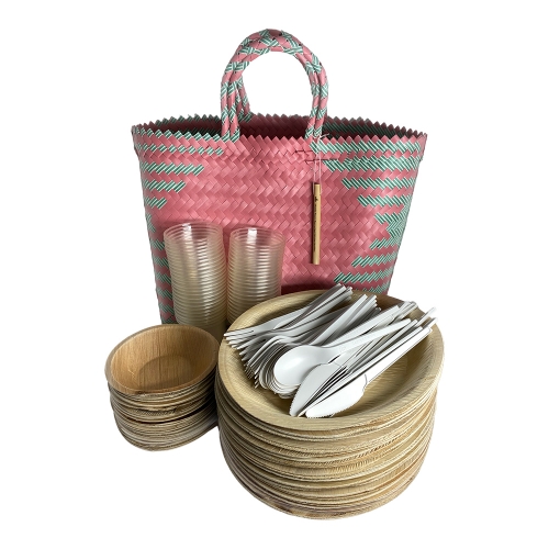 Our eco-friendly dinnerware set gives you a high quality, durable feel while providing a guilt-free disposable solution. The biodegradable plates and compostable cutlery offer reliable strength which holds their shape, prevent leaks and impart no flavour. It consists in a 150 pieces pack of 50 round palm leaf plates (25u of 24cm, 25u of 13cm), 25 compostable drinking glasses, 25 compostable cutlery set (knife, fork and spoon), and an attractive eco-friendly bag (30x16x30cm). Plenty to serve an intimate gathering or small party of close friends and family.