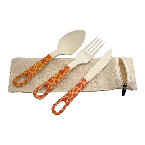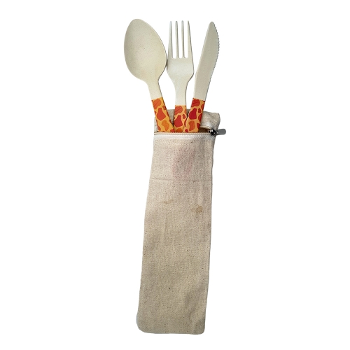 Our Reusable Bamboo Cutlery Set in a Zipper Bag – Giraffe Print Design is a practical adult-sized reusable cutlery set. It is made from bamboo, which is one of the world’s most sustainable materials due to its fast regrowth cycle. The cutlery set includes a spoon, fork and knife, approx 17cm in length. This Set comes in its cotton zipper case.