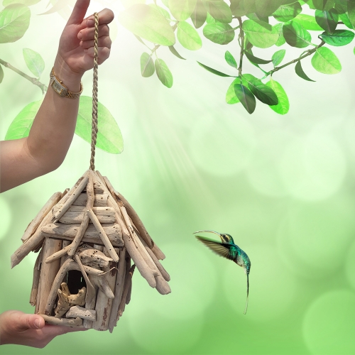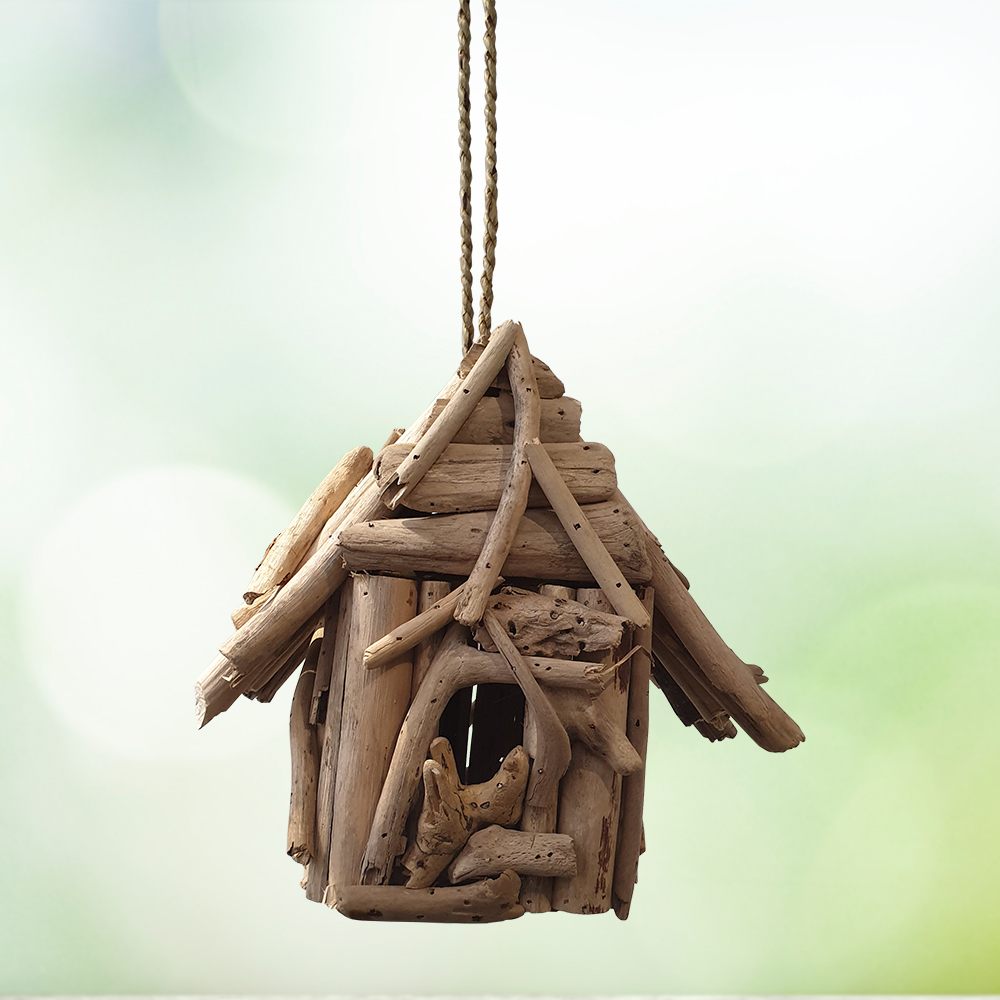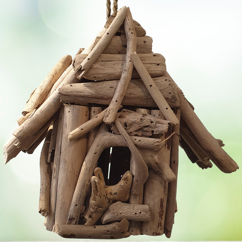 This Bird House is made from driftwood. Natural, sustainable materials. A great addition to the bird lover’s home. If you are an avid bird watcher, this feeder for birds will help make your home welcoming to all beautiful creatures. Perfect shelter for small birds. Observe them from the comfort of your home. They may even break into a song just for you!