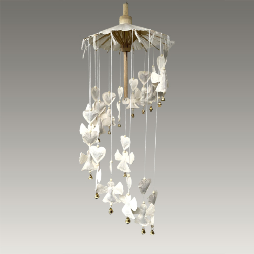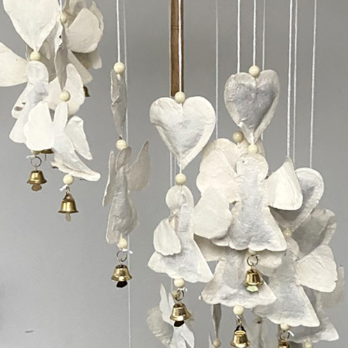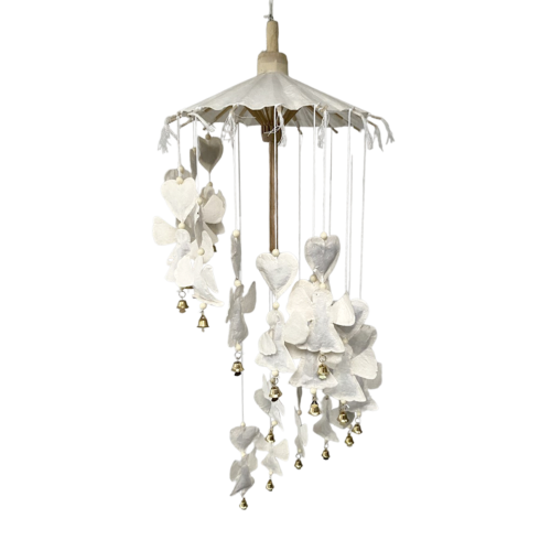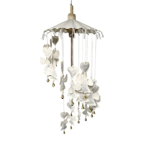 Handmade Mulberry Paper Angel Mobile, 50x20cm. These fair trade Saa paper mobiles are handmade from the bark of the mulberry tree. This mobile has been designed in a brolly style, strings are attached to the brolly with the main decoration added. This elegant white mobile makes a pleasant noise when blown in the wind or moved due to the small bells hanging below the white angels and hearts.