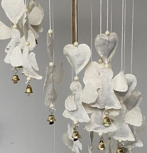 Handmade Mulberry Paper Angel Mobile, 50x20cm. These fair trade Saa paper mobiles are handmade from the bark of the mulberry tree. This mobile has been designed in a brolly style, strings are attached to the brolly with the main decoration added. This elegant white mobile makes a pleasant noise when blown in the wind or moved due to the small bells hanging below the white angels and hearts.