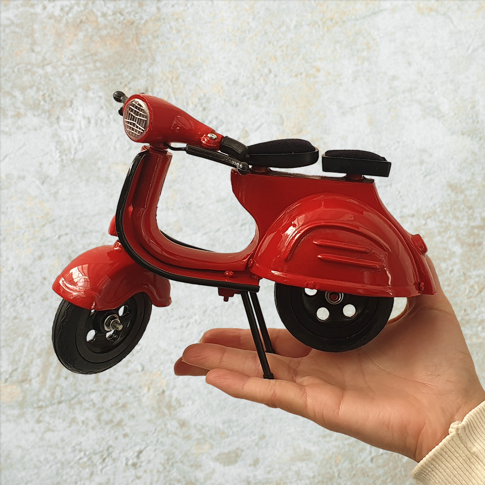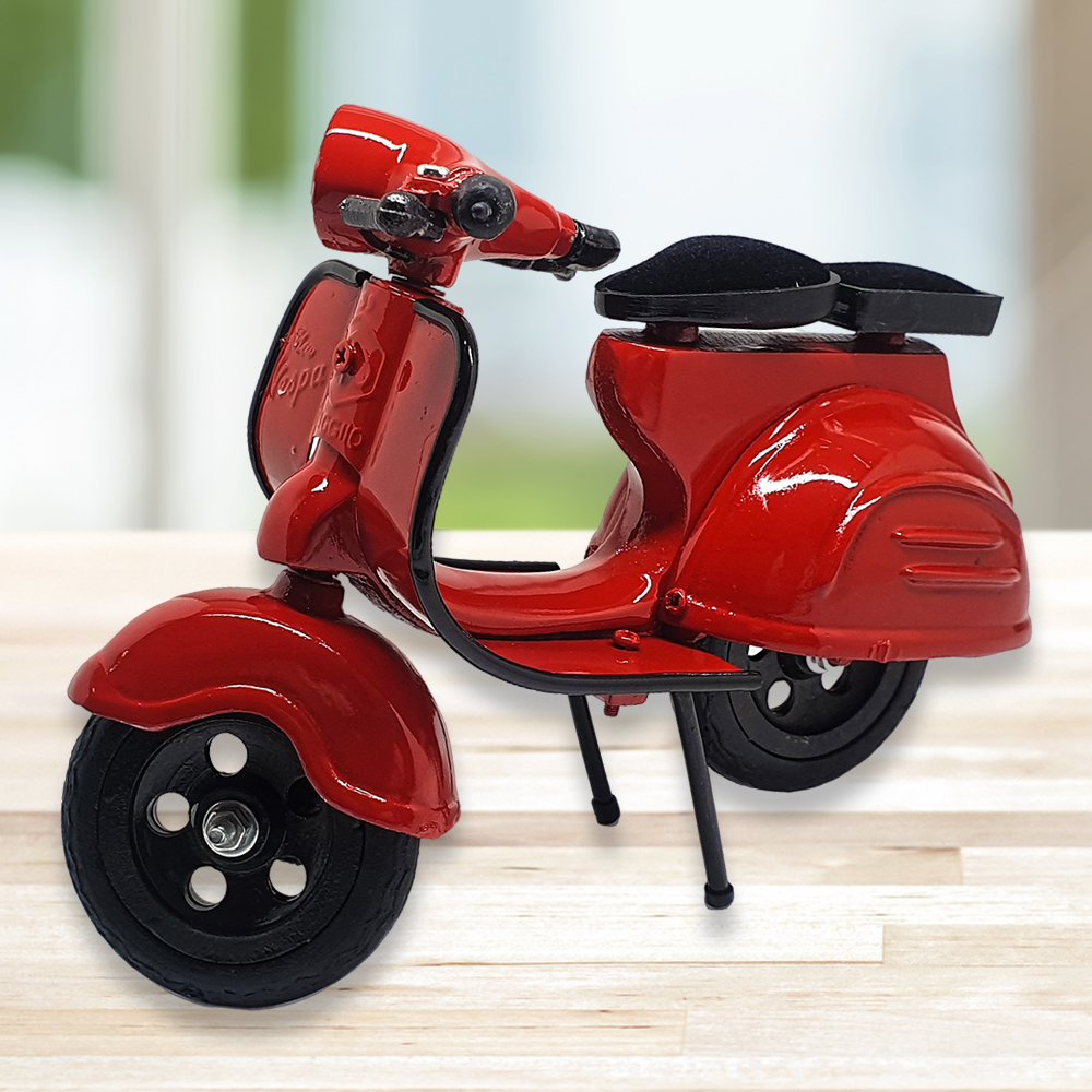 Our Vintage Model Vespa 22x15cm is a unique and handmade Vespa model for decoration. Vespa is now a vintage treasure that inspires this statuette. This scooter is replicated in brass, iron and aluminium, a mica headlight, rubber tires and velvet seat. A very nice and fun product for home and office decoration. This is also a great gift for collectors, motorcycle lovers, friends and children.