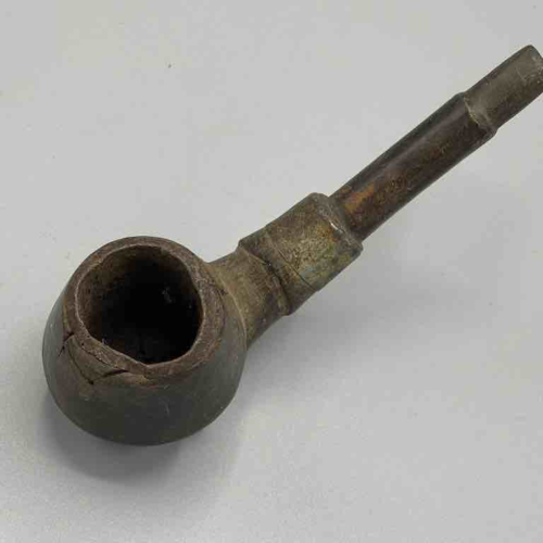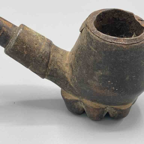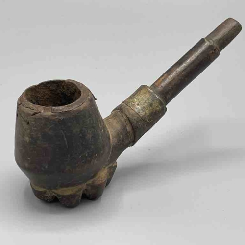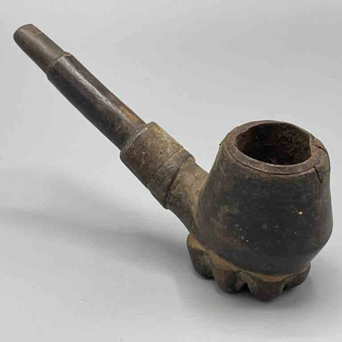 Pipe smoking of tobacco is a long-standing traditional activity in African villages across the Continent. Although many such pipes are common and ordinary in design the genre has given rise to a very well-developed form of African artistic expression. This pipe is not among the most exceptional but is very old and worn and has a very nicely detailed base on which the pipe stands when not in use. The mouthpiece is a harder, more dense wood. This is old and worn but remains in excellent condition. 5 3/4″ long x 1 3/4″ wide x 2 1/4″ bowl height (15 x 4 x 6 cm)