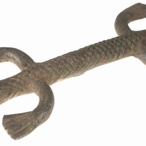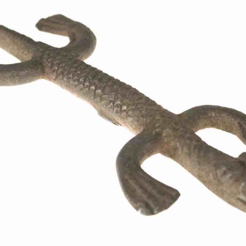 This very old crocodile figure is very typical of the Bamana people and employs the lost wax brass casting technique typical among many African peoples. It measures:6 1/2 x 2 3/8 x 1/2″ (16.5 x 6 x 1.3 cm)