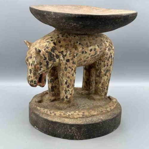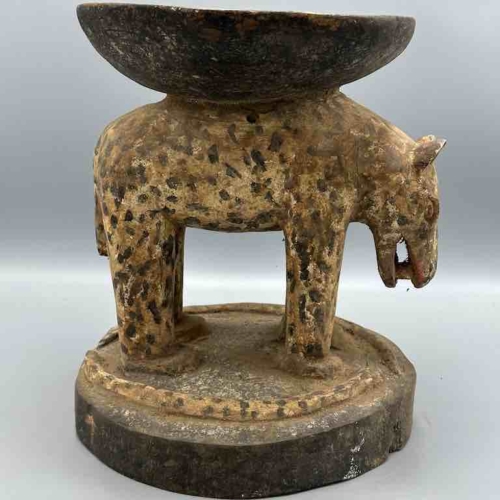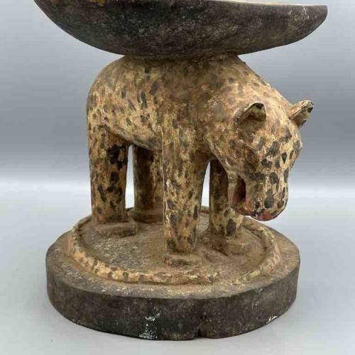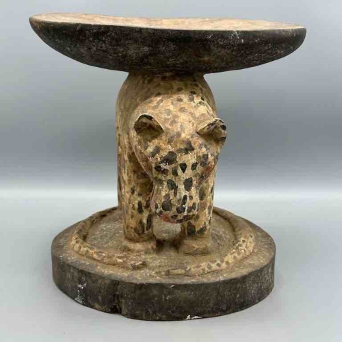 This is a classic form of a traditional Baule stool from Ivory Coast, featuring a leopard, an animal both feared and admired by African communities. 11 1/2″ tall x 11 3/8″ wide x 8 5/8″ (29 x 29 x 22 cm)