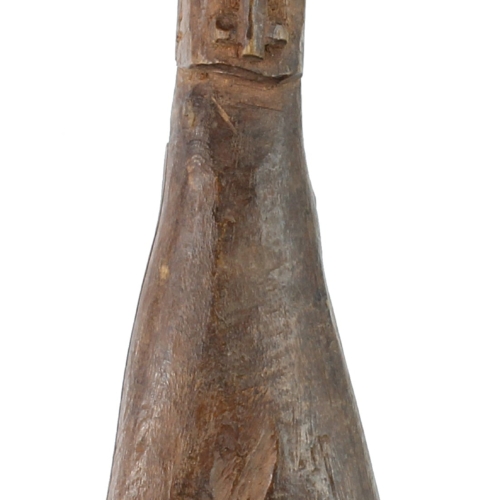 Slingshots are carried by young boys for hunting birds and bats in the forest, sources of protein in places where that is often scarce. The slings are made, usually, by the father of the boy (though more wealthy families will commission one from a professional carver.) The carvings are talismanic, meant to protect the boy. Most carvings are of deities or spirits, often woodland spirits, which are always female and often red. European nail polish is a favored source of the red color. Masks abound, sometimes with the entire costume used in dance. There is a feeling that the mask carvings function best as protectors if they are facing the source of danger, and “right-side up,” rather than upside down. For that reason, a sling will very often have two masks, facing in opposite directions; two masks, one oriented up and one down, or both. There may be up to eight masks, “to cover all the bases”. Other subjects for the carving enhance hunting power or the chances of success. These include guns (or many types), soldiers, Christian religious symbols, or powerful animals (elephants, etc.) Occasionally, unusual subjects such as soccer players or soccer trophies will appear. The variety is virtually endless. The sling portion is usually rubber cut from old inner tubes. It almost never survives the stress of transport or the dry climate here. This Slingshot measures 8″ x 3″