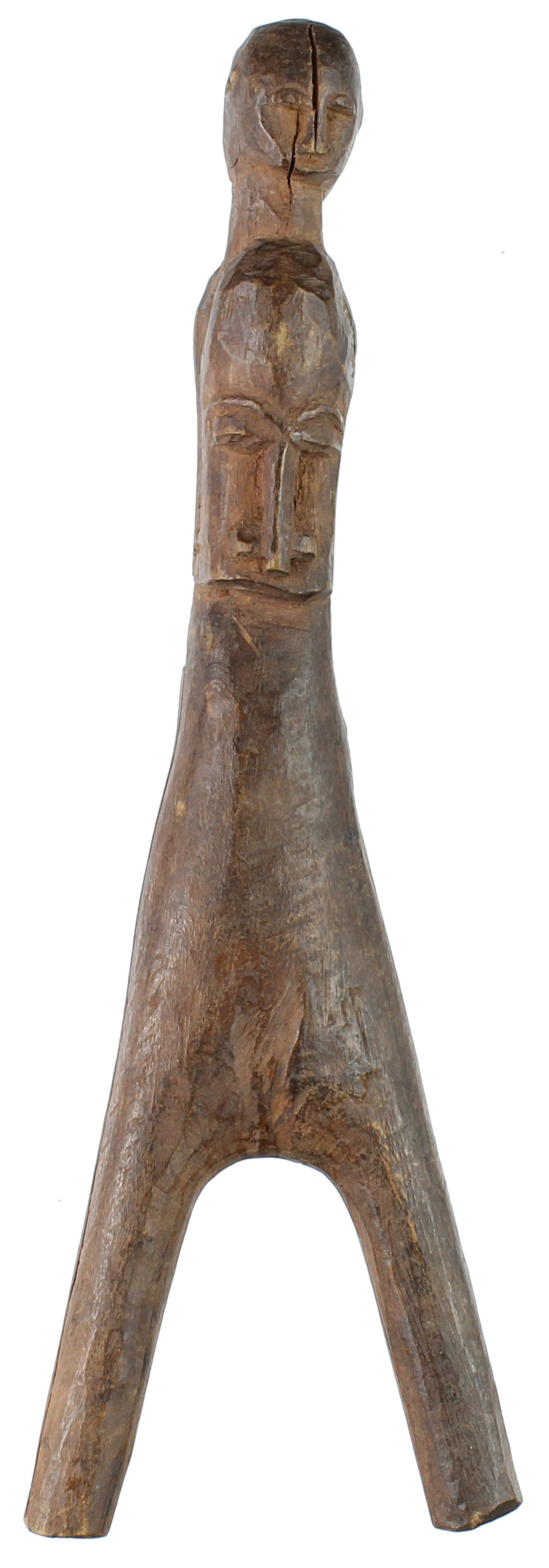 Slingshots are carried by young boys for hunting birds and bats in the forest, sources of protein in places where that is often scarce. The slings are made, usually, by the father of the boy (though more wealthy families will commission one from a professional carver.) The carvings are talismanic, meant to protect the boy. Most carvings are of deities or spirits, often woodland spirits, which are always female and often red. European nail polish is a favored source of the red color. Masks abound, sometimes with the entire costume used in dance. There is a feeling that the mask carvings function best as protectors if they are facing the source of danger, and “right-side up,” rather than upside down. For that reason, a sling will very often have two masks, facing in opposite directions; two masks, one oriented up and one down, or both. There may be up to eight masks, “to cover all the bases”. Other subjects for the carving enhance hunting power or the chances of success. These include guns (or many types), soldiers, Christian religious symbols, or powerful animals (elephants, etc.) Occasionally, unusual subjects such as soccer players or soccer trophies will appear. The variety is virtually endless. The sling portion is usually rubber cut from old inner tubes. It almost never survives the stress of transport or the dry climate here. This Slingshot measures 8″ x 3″