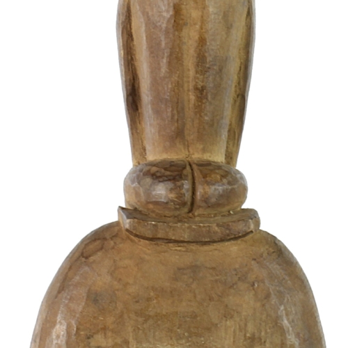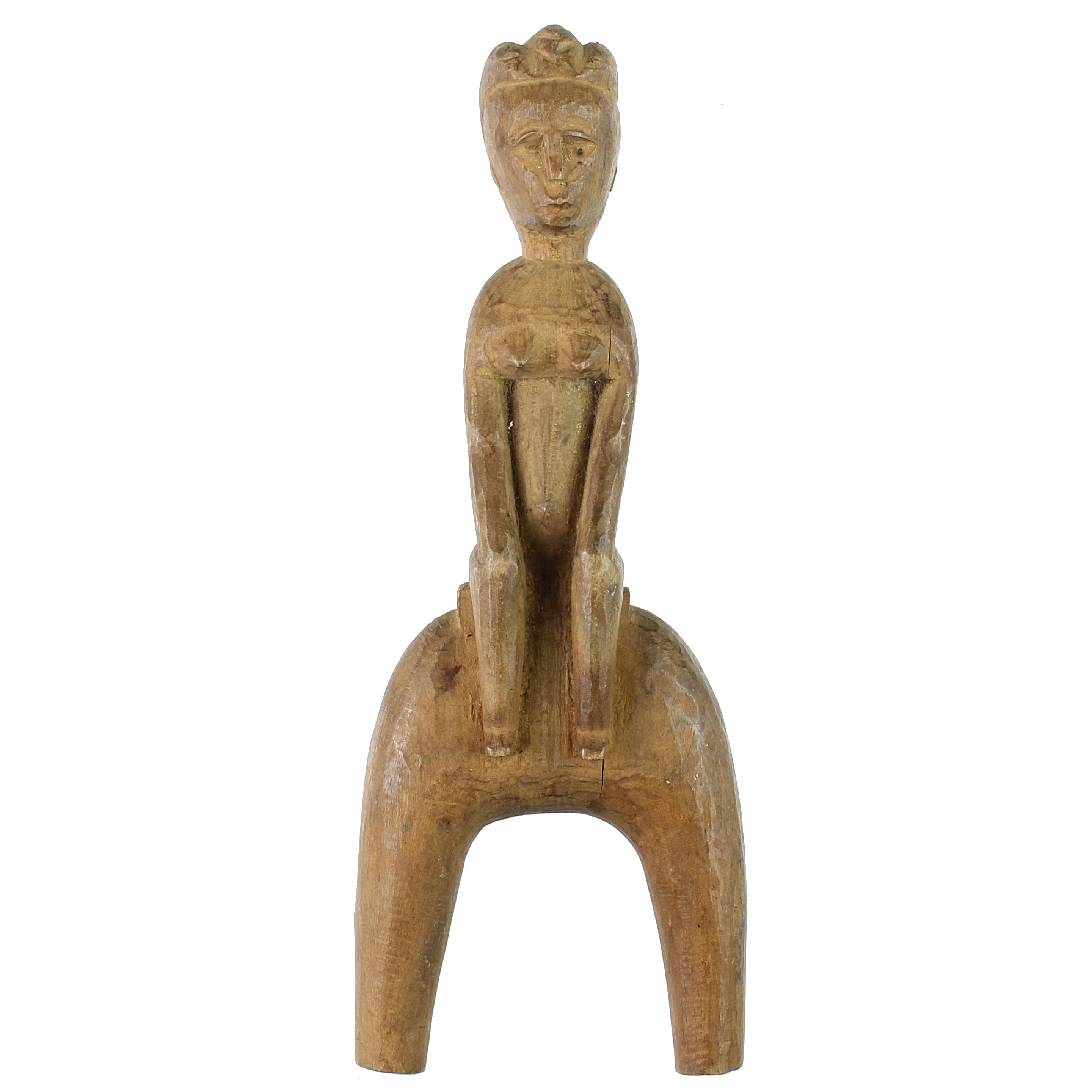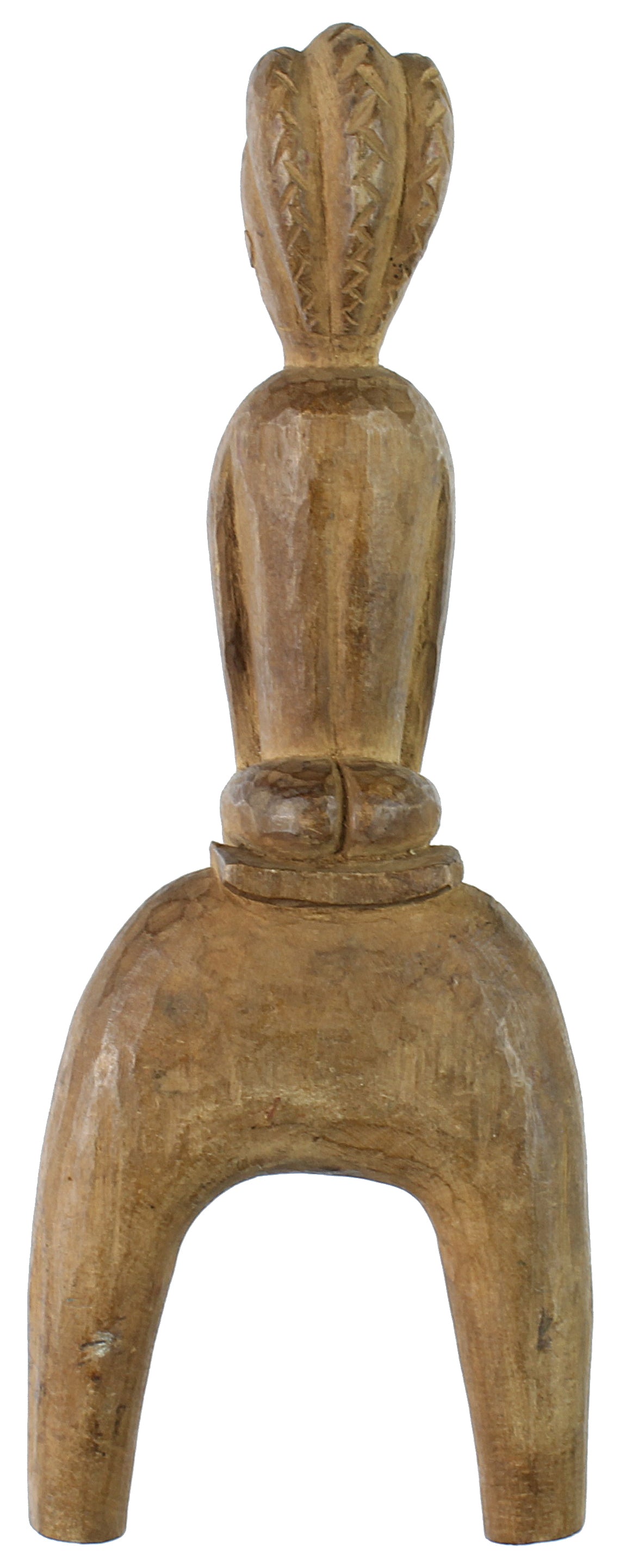 Slingshots are carried by young boys for hunting birds and bats in the forest, sources of protein in places where that is often scarce. The slings are made, usually, by the father of the boy (though more wealthy families will commission one from a professional carver.) The carvings are talismanic, meant to protect the boy. Most carvings are of deities or spirits, often woodland spirits, which are always female and often red. European nail polish is a favored source of the red color. Masks abound, sometimes with the entire costume used in dance. There is a feeling that the mask carvings function best as protectors if they are facing the source of danger, and “right-side up,” rather than upside down. For that reason, a sling will very often have two masks, facing in opposite directions; two masks, one oriented up and one down, or both. There may be up to eight masks, “to cover all the bases”. Other subjects for the carving enhance hunting power or the chances of success. These include guns (or many types), soldiers, Christian religious symbols, or powerful animals (elephants, etc.) Occasionally, unusual subjects such as soccer players or soccer trophies will appear. The variety is virtually endless. The sling portion is usually rubber cut from old inner tubes. It almost never survives the stress of transport or the dry climate here. This Slingshot measures 8″ x 3″