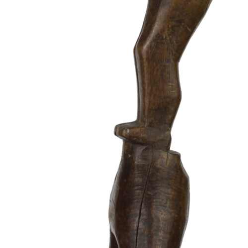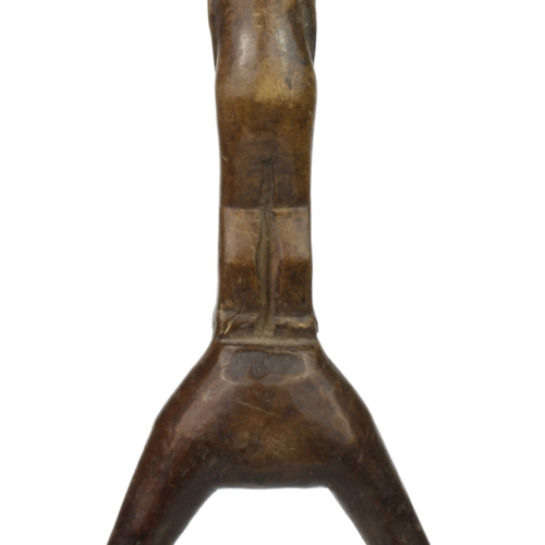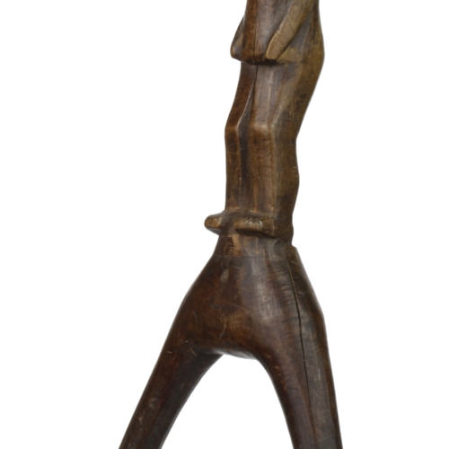 This slingshot is mounted on lucite. The slingshots are carried by young boys for hunting birds and bats in the forest, sources of protein in places where that is often scarce. However, dangers abound, such as snakes, dangerous insects, and the rare predator. The slings are made, usually, by the father of the boy (though more wealthy families will commission one from a professional carver.) The carvings are talismanic, meant to protect the boy. Most carvings are of deities or spirits, often woodland spirits, which are always female and often red. European nail polish is a favored source of the red color. Masks abound, sometimes with the entire costume used in dance. There is a feeling that the mask carvings function best as protectors if they are facing the source of danger, and “right-side up,” rather than upside down. For that reason, a sling will very often have two masks, facing in opposite directions; two masks, one oriented up and one down, or both. There may be up to eight masks, “to cover all the bases”. Other subjects for the carving enhance hunting power or the chances of success. These include guns (or many types), soldiers, Christian religious symbols, or powerful animals (elephants, etc.) Occasionally, unusual subjects such as soccer players or soccer trophies will appear. The variety is virtually endless. The sling portion is usually rubber cut from old inner tubes. It almost never survives the stress of transport or the dry climate here. This Slingshot measures 9″ x 3.5″ x .8″