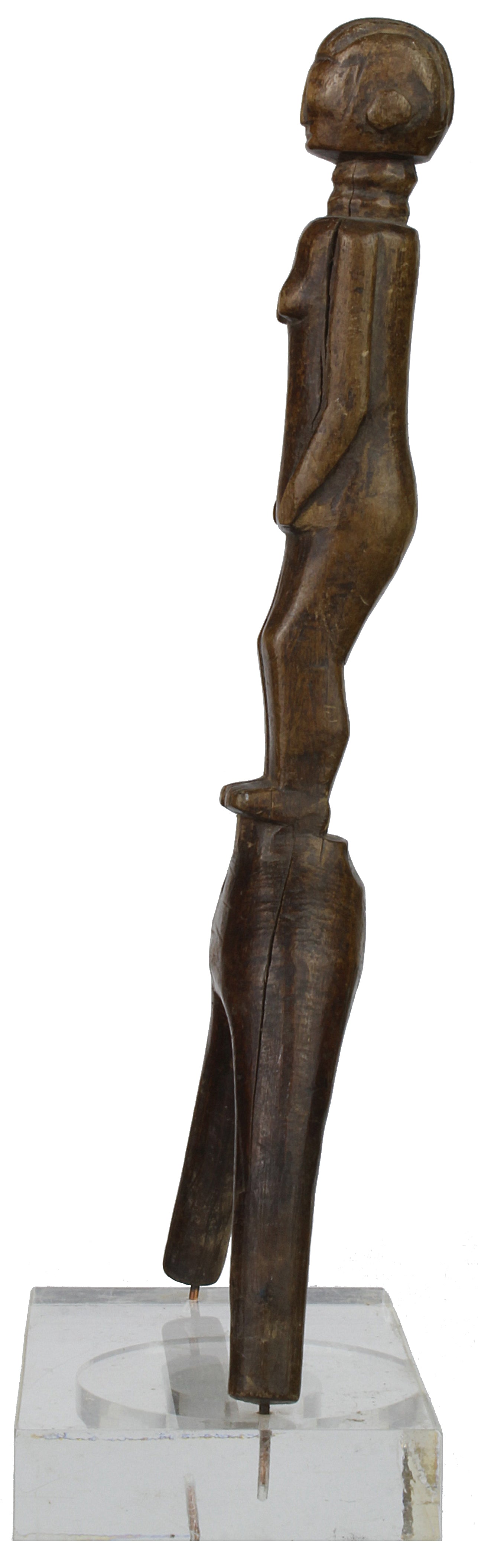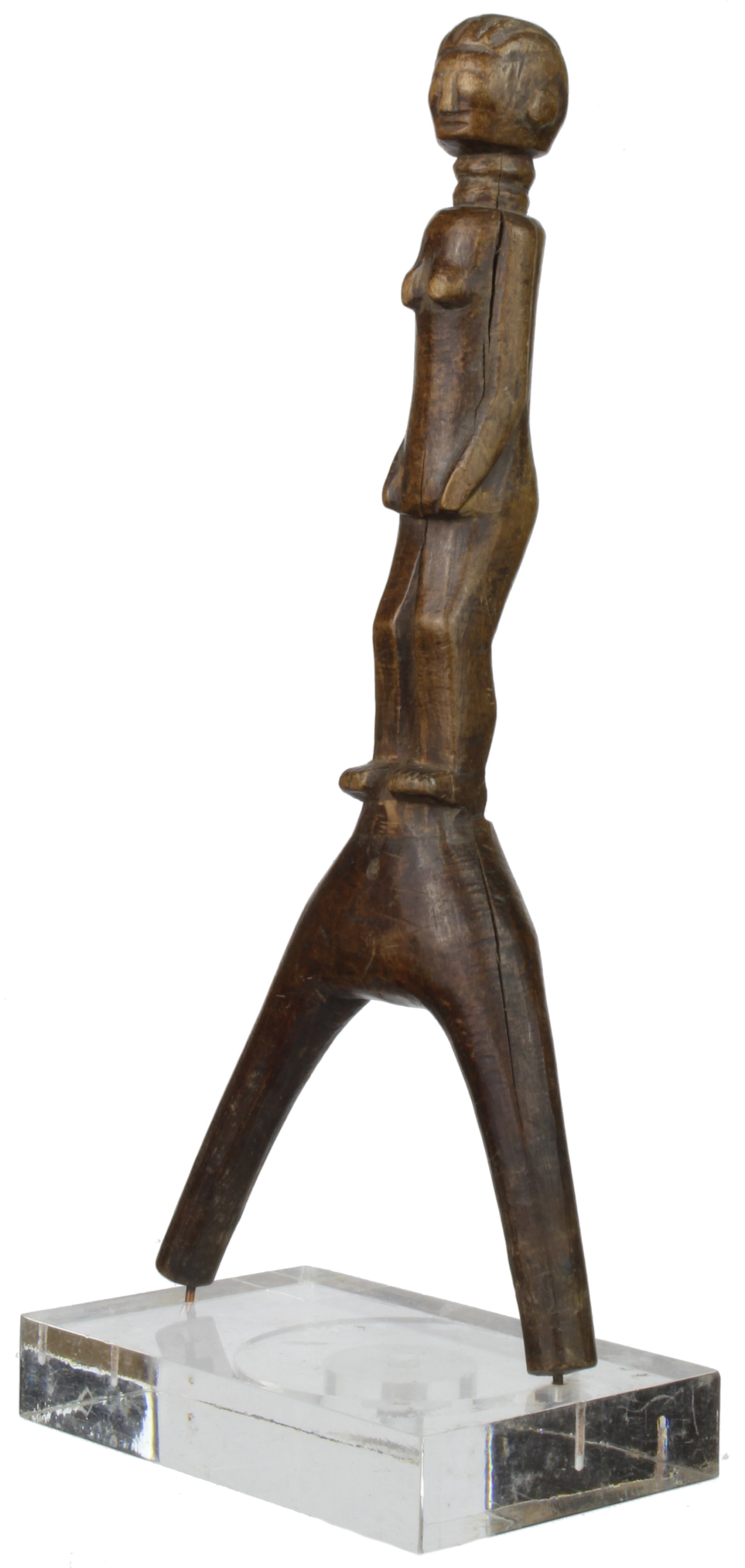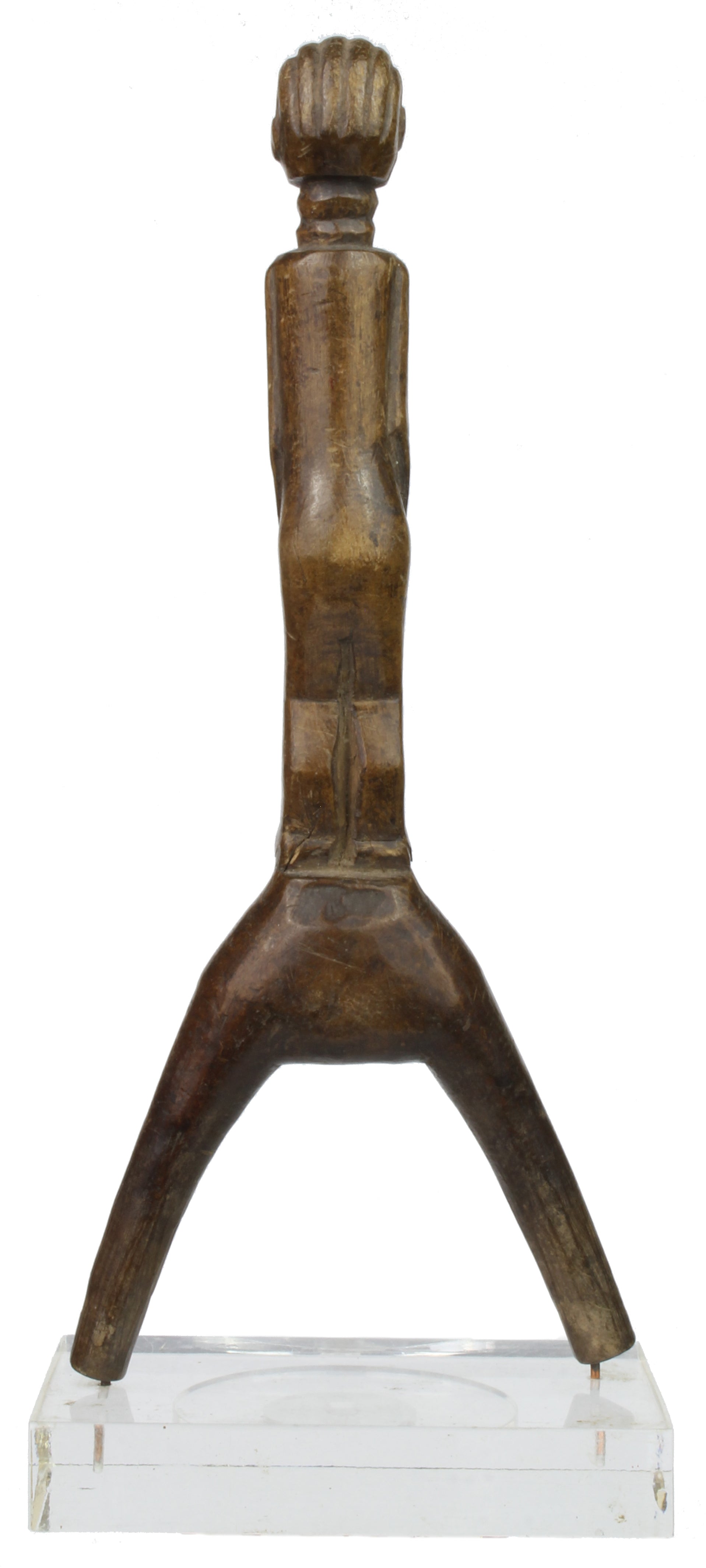 This slingshot is mounted on lucite. The slingshots are carried by young boys for hunting birds and bats in the forest, sources of protein in places where that is often scarce. However, dangers abound, such as snakes, dangerous insects, and the rare predator. The slings are made, usually, by the father of the boy (though more wealthy families will commission one from a professional carver.) The carvings are talismanic, meant to protect the boy. Most carvings are of deities or spirits, often woodland spirits, which are always female and often red. European nail polish is a favored source of the red color. Masks abound, sometimes with the entire costume used in dance. There is a feeling that the mask carvings function best as protectors if they are facing the source of danger, and “right-side up,” rather than upside down. For that reason, a sling will very often have two masks, facing in opposite directions; two masks, one oriented up and one down, or both. There may be up to eight masks, “to cover all the bases”. Other subjects for the carving enhance hunting power or the chances of success. These include guns (or many types), soldiers, Christian religious symbols, or powerful animals (elephants, etc.) Occasionally, unusual subjects such as soccer players or soccer trophies will appear. The variety is virtually endless. The sling portion is usually rubber cut from old inner tubes. It almost never survives the stress of transport or the dry climate here. This Slingshot measures 9″ x 3.5″ x .8″