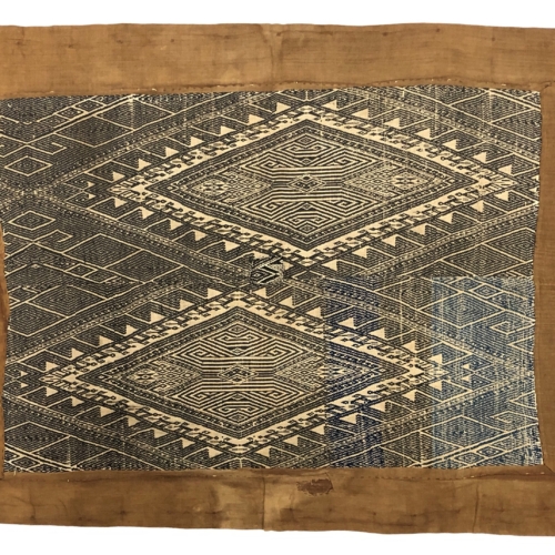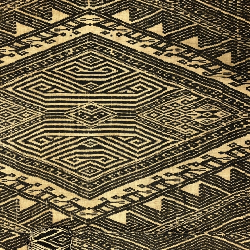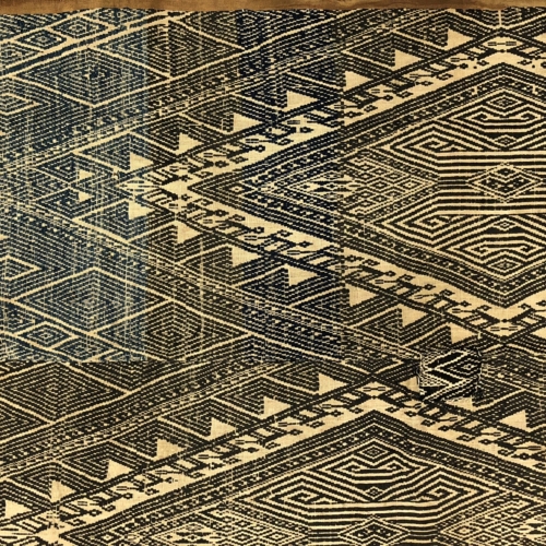 Although the majority of the population of modern Vietnam is ethnic Vietnamese there are many tribes of other ethnicities, each with its own language and culture, completely separate from the Vietnamese cultural majority. One of those ethnic minorities, as they are called in Vietnam is the Tay. A subgroup of the Tay are the “Black Tay”, residing in the mountains of Northern Vietnam. Their signature handwoven blanket, is used for warmth during the rainy season, the winter, of Vietnam, where temperatures can get well below freezing. Their textiles are most commonly recognized by their diamond shaped patterns. With a stunning central woven panel of natural black and white cotton, consisting of two bands each roughly 13″ wide. Many blankets in their full form will have a border around the central panel to increase its size. Sometimes the border may be removed before selling, or replaced with a newer border when the previous one gets old. The approximate age is over 40 years, which is sometimes quite evident by patches of fading color or repairs of different colored threads5 This blanket measures 63″ x 44″ (160cm x 112cm). Interior dimensions measure 47″ x 33″ (119cm x 84cm)