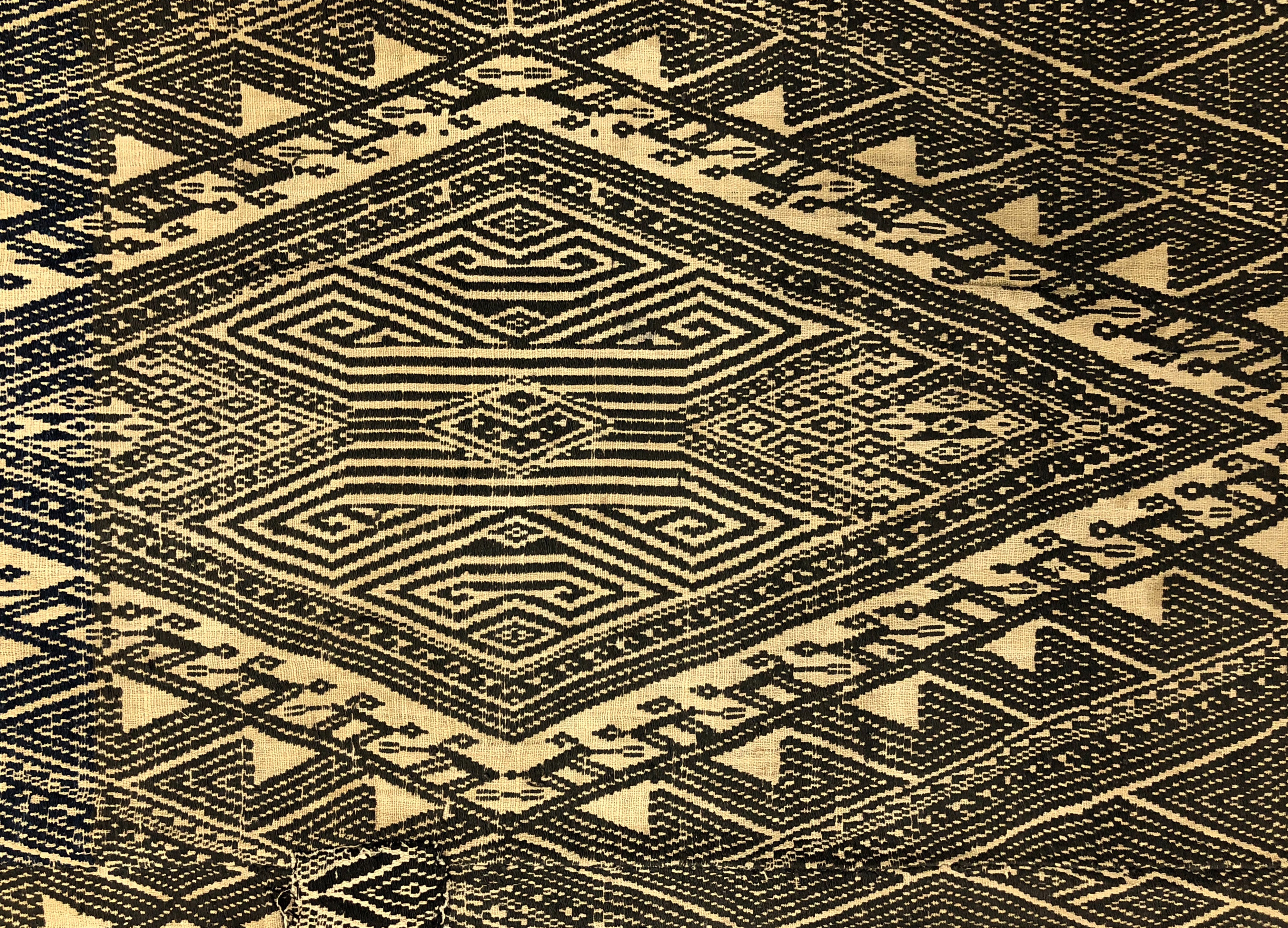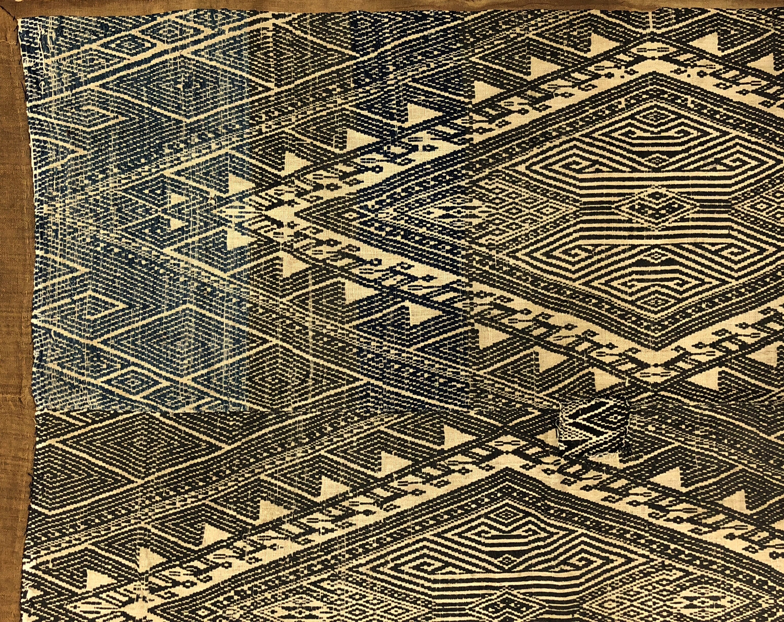 Although the majority of the population of modern Vietnam is ethnic Vietnamese there are many tribes of other ethnicities, each with its own language and culture, completely separate from the Vietnamese cultural majority. One of those ethnic minorities, as they are called in Vietnam is the Tay. A subgroup of the Tay are the “Black Tay”, residing in the mountains of Northern Vietnam. Their signature handwoven blanket, is used for warmth during the rainy season, the winter, of Vietnam, where temperatures can get well below freezing. Their textiles are most commonly recognized by their diamond shaped patterns. With a stunning central woven panel of natural black and white cotton, consisting of two bands each roughly 13″ wide. Many blankets in their full form will have a border around the central panel to increase its size. Sometimes the border may be removed before selling, or replaced with a newer border when the previous one gets old. The approximate age is over 40 years, which is sometimes quite evident by patches of fading color or repairs of different colored threads5 This blanket measures 63″ x 44″ (160cm x 112cm). Interior dimensions measure 47″ x 33″ (119cm x 84cm)