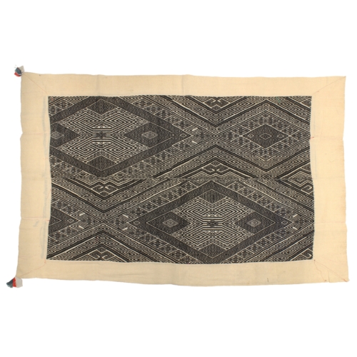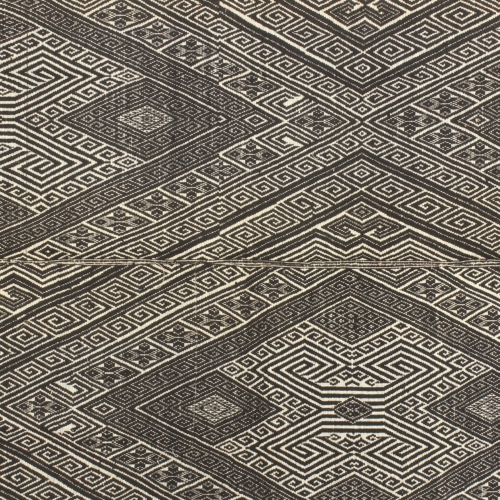Although the majority of the population of modern Vietnam is ethnic Vietnamese there are many tribes of other ethnicities, each with its own language and culture, completely separate from the Vietnamese cultural majority. One of those ethnic minorities, as they are called in Vietnam is the Tay. A subgroup of the Tay are the “Black Tay”, residing in the mountains of Northern Vietnam. Their signature handwoven blanket, is used for warmth during the rainy season, the winter, of Vietnam, where temperatures can get well below freezing. Their textiles are most commonly recognized by their diamond shaped patterns. With a stunning central woven panel of natural black and white cotton, consisting of two bands each roughly 13″ wide. Many blankets in their full form will have a border around the central panel to increase its size. Sometimes the border may be removed before selling, or replaced with a newer border when the previous one gets old. The approximate age is over 40 years, which is sometimes quite evident by patches of fading color or repairs of different colored threads. This blanket measures 60″ x 37″