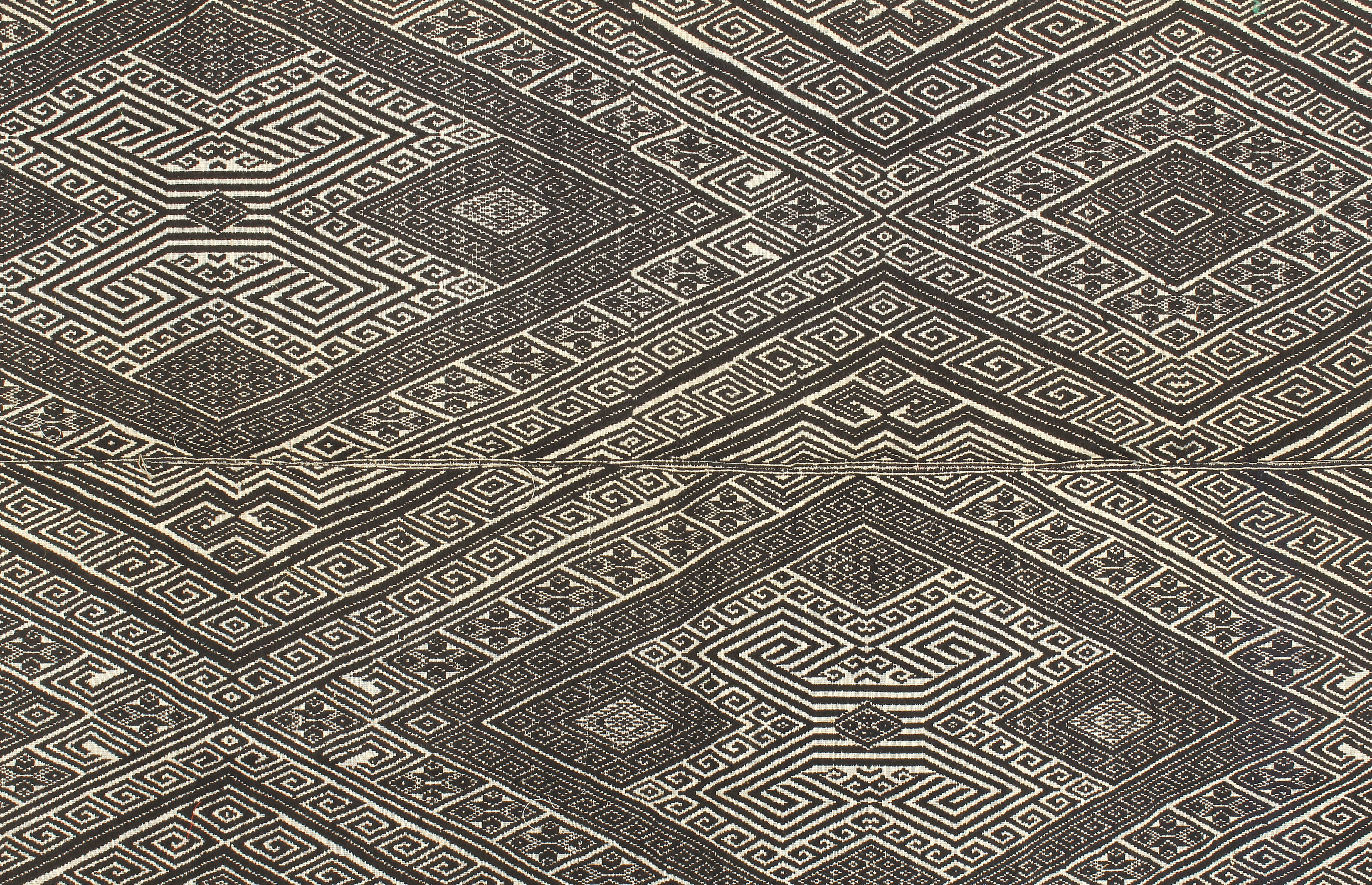 Although the majority of the population of modern Vietnam is ethnic Vietnamese there are many tribes of other ethnicities, each with its own language and culture, completely separate from the Vietnamese cultural majority. One of those ethnic minorities, as they are called in Vietnam is the Tay. A subgroup of the Tay are the “Black Tay”, residing in the mountains of Northern Vietnam. Their signature handwoven blanket, is used for warmth during the rainy season, the winter, of Vietnam, where temperatures can get well below freezing. Their textiles are most commonly recognized by their diamond shaped patterns. With a stunning central woven panel of natural black and white cotton, consisting of two bands each roughly 13″ wide. Many blankets in their full form will have a border around the central panel to increase its size. Sometimes the border may be removed before selling, or replaced with a newer border when the previous one gets old. The approximate age is over 40 years, which is sometimes quite evident by patches of fading color or repairs of different colored threads. This blanket measures 60″ x 37″