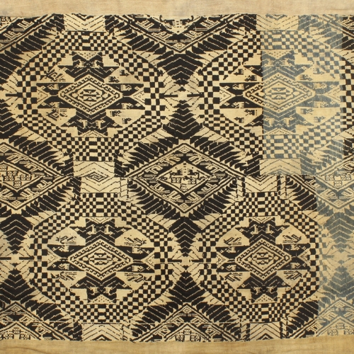 Although the majority of the population of modern Vietnam is ethnic Vietnamese there are many tribes of other ethnicities, each with its own language and culture, completely separate from the Vietnamese cultural majority. One of those ethnic minorities, as they are called in Vietnam is the Tay. A subgroup of the Tay are the “Black Tay”, residing in the mountains of Northern Vietnam. Their signature handwoven blanket, is used for warmth during the rainy season, the winter, of Vietnam, where temperatures can get well below freezing. Their textiles are most commonly recognized by their diamond shaped patterns. With a stunning central woven panel of natural black and white cotton, consisting of two bands each roughly 13″ wide. Many blankets in their full form will have a border around the central panel to increase its size. Sometimes the border may be removed before selling, or replaced with a newer border when the previous one gets old. The approximate age is over 40 years, which is sometimes quite evident by patches of fading color or repairs of different colored threads. This blanket measures 66″ x 48″