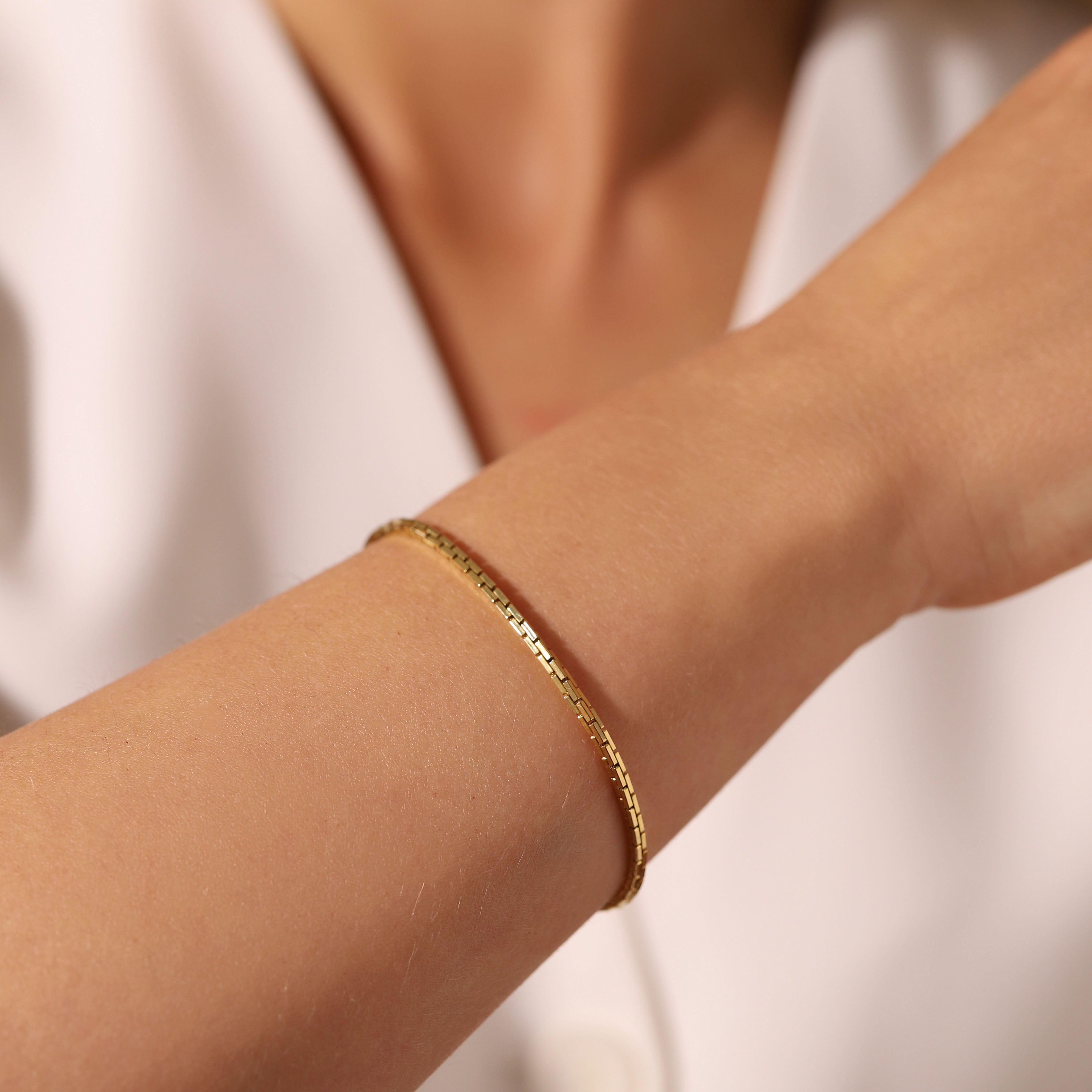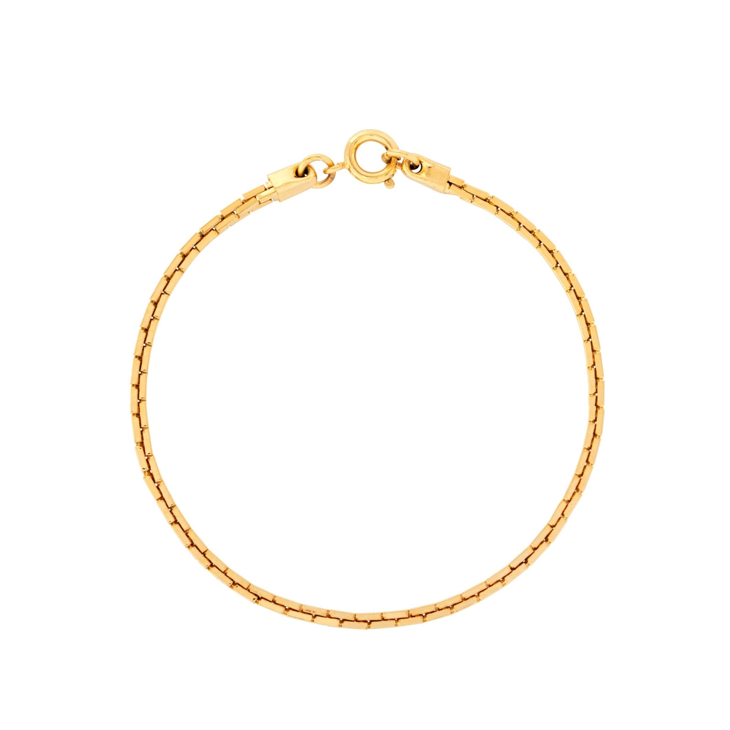 DESCRIPTIONCrafted in England in the 1990’s, this genuine rediscovered vintage bracelet is brand new and available for you to own a piece of jewellery history, in limited numbers. Featuring high-shine, thick 22ct gold plating on an alloy base metal, this simple, polished design is a box chain formed by long rectangle links. Featuring spring ring clasp. SIZINGFull bracelet length measures approx. 20cm including clasp. Width measures approx. 2.5cm. GOOD TO KNOWAs the GT Vintage range is genuine vintage, each piece will be unique and may have minor imperfections. Extra care should be taken during wear and pieces should not come into contact with water, sweat, perfume and other substances that may damage its finish. Please note vintage jewellery is made from brass/copper/alloy metals and then plated with gold and therefore may contain nickel – those allergic to nickel should avoid allowing the jewellery making contact with the skin. PACKAGINGDelivered in a Gold Trip presentation box, perfect for gifting yourself or others.
