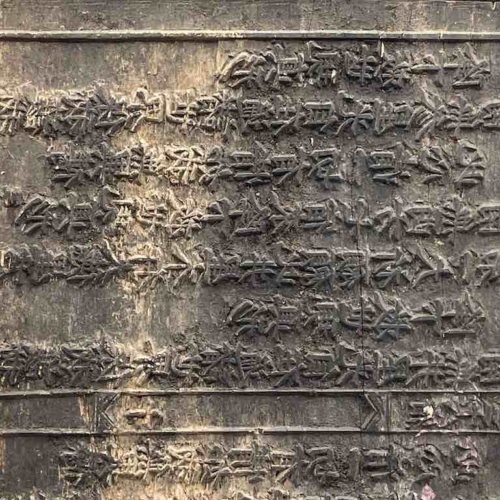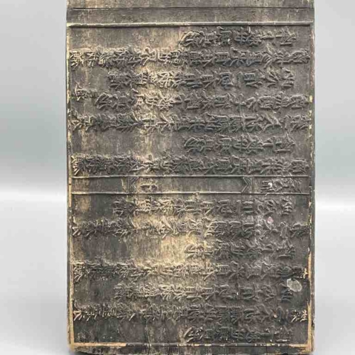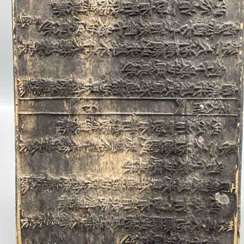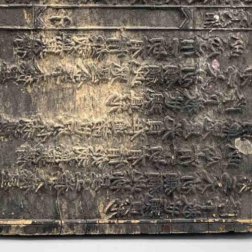 This very old hand-carved wooden offset printing plate went out of use in Vietnam over 100 years ago. The Vietnamese language has been in existence as long as there have been Vietnamese people but it first became a written language during the 1,000-year period of Chinese occupation, 111 BC – 938 AD, so it was written using the Chinese characters, Chu nom, incorporated into this vintage plate. The modern latin alphabet, universally in use today in Vietnam, was first introduced to Vietnam in the 17th century but was only finally completely adopted for all written language use in Vietnam circa 1918. 13 1/4 x 8″ (34 x 20 cm)