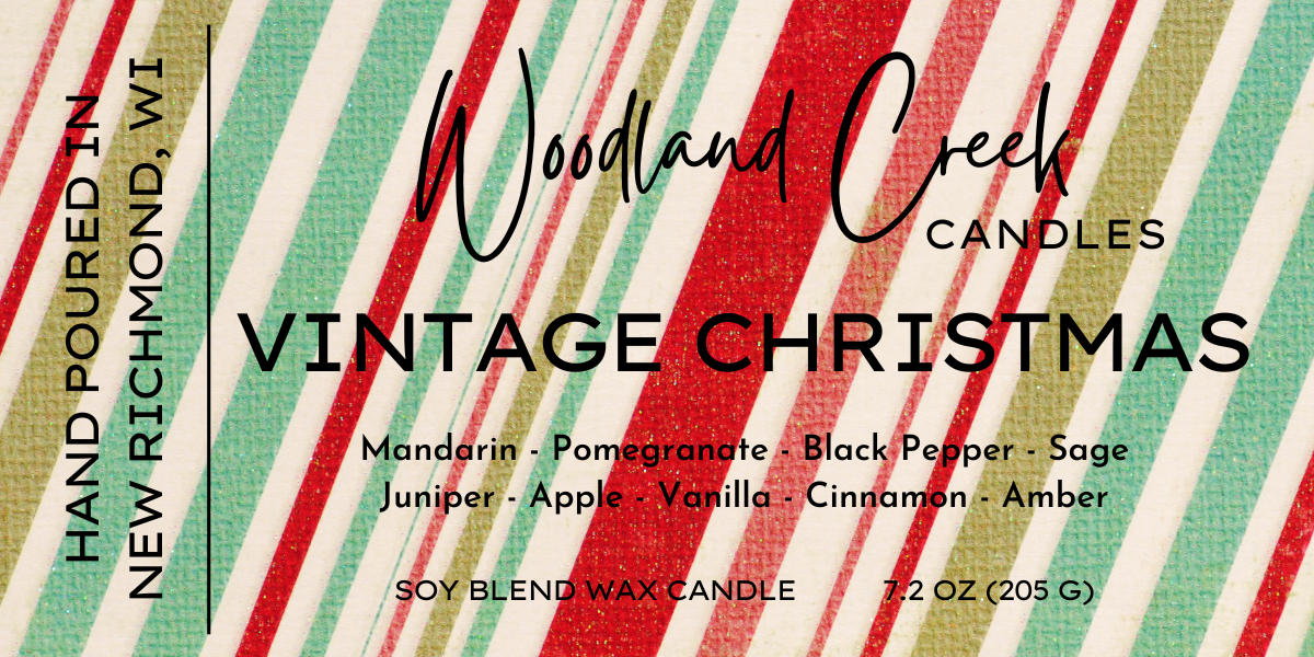 Vintage Christmas – Soy Blend Candle Nostalgic, warm, and timeless—Vintage Christmas captures the essence of cozy holiday gatherings and cherished traditions. Sweet mandarin, pomegranate, and a touch of black pepper lead into an aromatic heart of sage, juniper, and crisp apple. Vanilla, cinnamon, and golden amber finish this fragrance with the comforting glow of old-fashioned holiday cheer. Hand-poured in New Richmond, WI, this soy blend candle features a cotton wick and provides 40–50 hours of festive, heartwarming fragrance. #VintageChristmasCandle #ClassicHolidayScent #MandarinAndJuniper #WarmAmberAndCinnamon #NostalgicChristmasFragrance #FamilyTraditionCandle #SoyBlendCandle #HandPouredInWisconsin #WoodlandCreekCandles