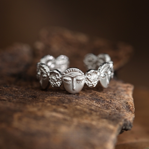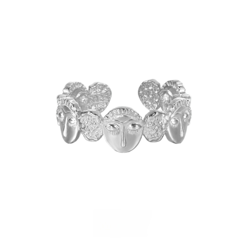 Crafted in 925 sterling silver, this adjustable ring showcases a unique band of abstract human faces with teardrop eyes. The oxidized and polished finish enhances the vintage texture and sculptural details, embodying a modern cool-girl aesthetic with a touch of surrealism. Ideal for boutiques seeking high-quality, artistic silver pieces with small-batch appeal.