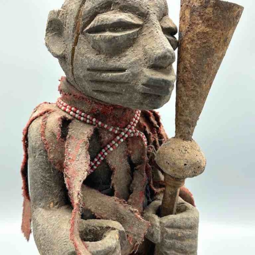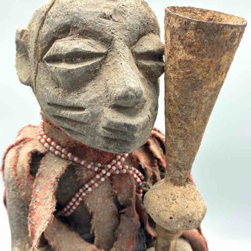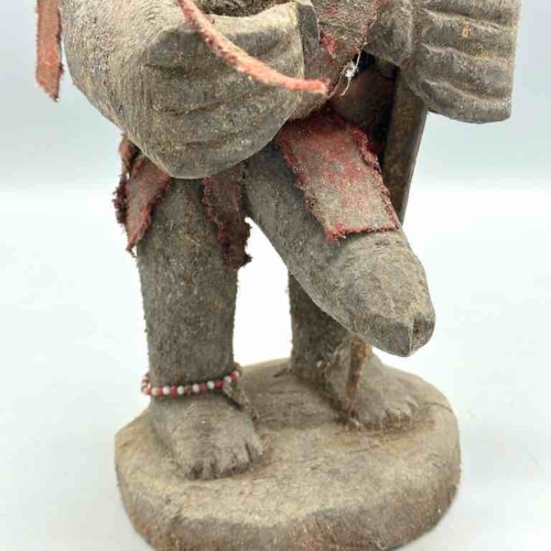 This vintage, authentic statue is a figure that was used for “fetish” purposes by Fon people in Benin. Its penis is of exaggerated size and he holds an iron gong, an object used traditionally to call the aid of the ancestral spirits. The interested person, the owner of it or the person who was using it, would place it in a personal household shrine together with other objects of spiritual significance for the purpose of accomplishing family goals, i.e., to improve health or any other condition the family faces. This statue measures: 5 x 5 1/2 x 14 3/4″ (13 x 14 x 37 cm)