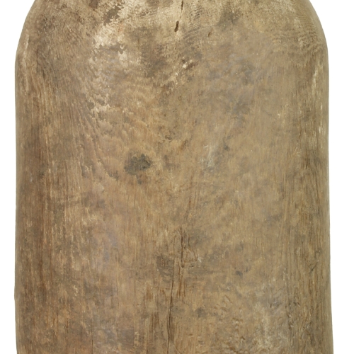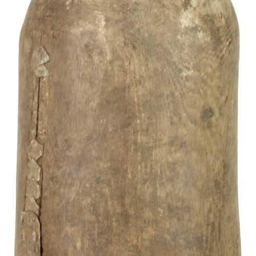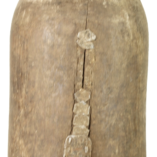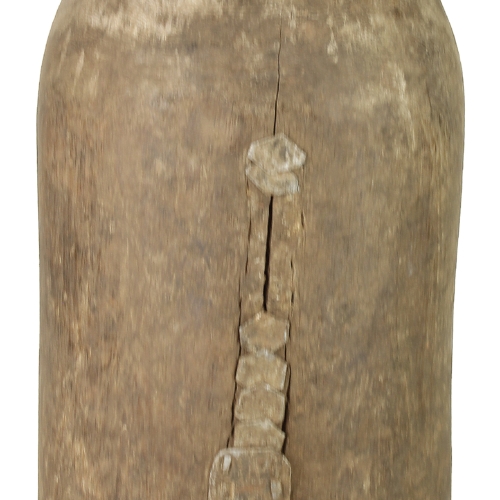 This is an old Hima (or Hema) container vase from Uganda. This beautiful Hima vessel was primarily used for storing liquids, which were most commonly milk. Making an object such as this is extremely time consuming, not only to get the symmetry and shape right, but primarily the length of time it takes to hollow out the center. Since this is an old object the use of power tools was not an option. Because of this, as the wood ages and dries, thus separating, it was more efficient to repair the separation with methods of repousse. Which is why this object has so many repairs in it. Luckily for our purposes this repairing bring amazing character and uniqueness. The container glistens in the light due to natural patina which almost shines the object with a protective layer. A perfect one of a kind decor object that will stand out in any modern room.This container measures 14″ x 6.5″