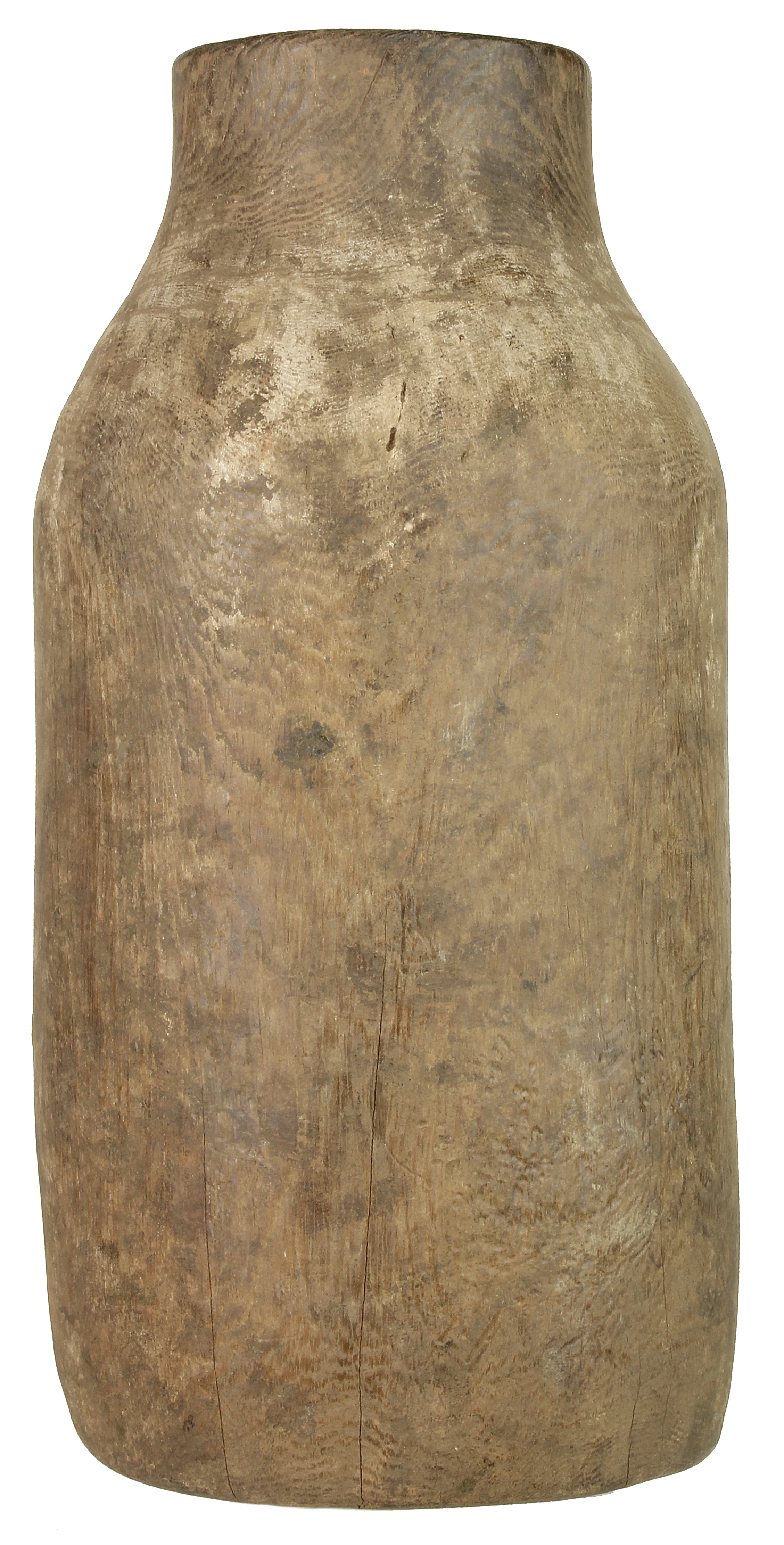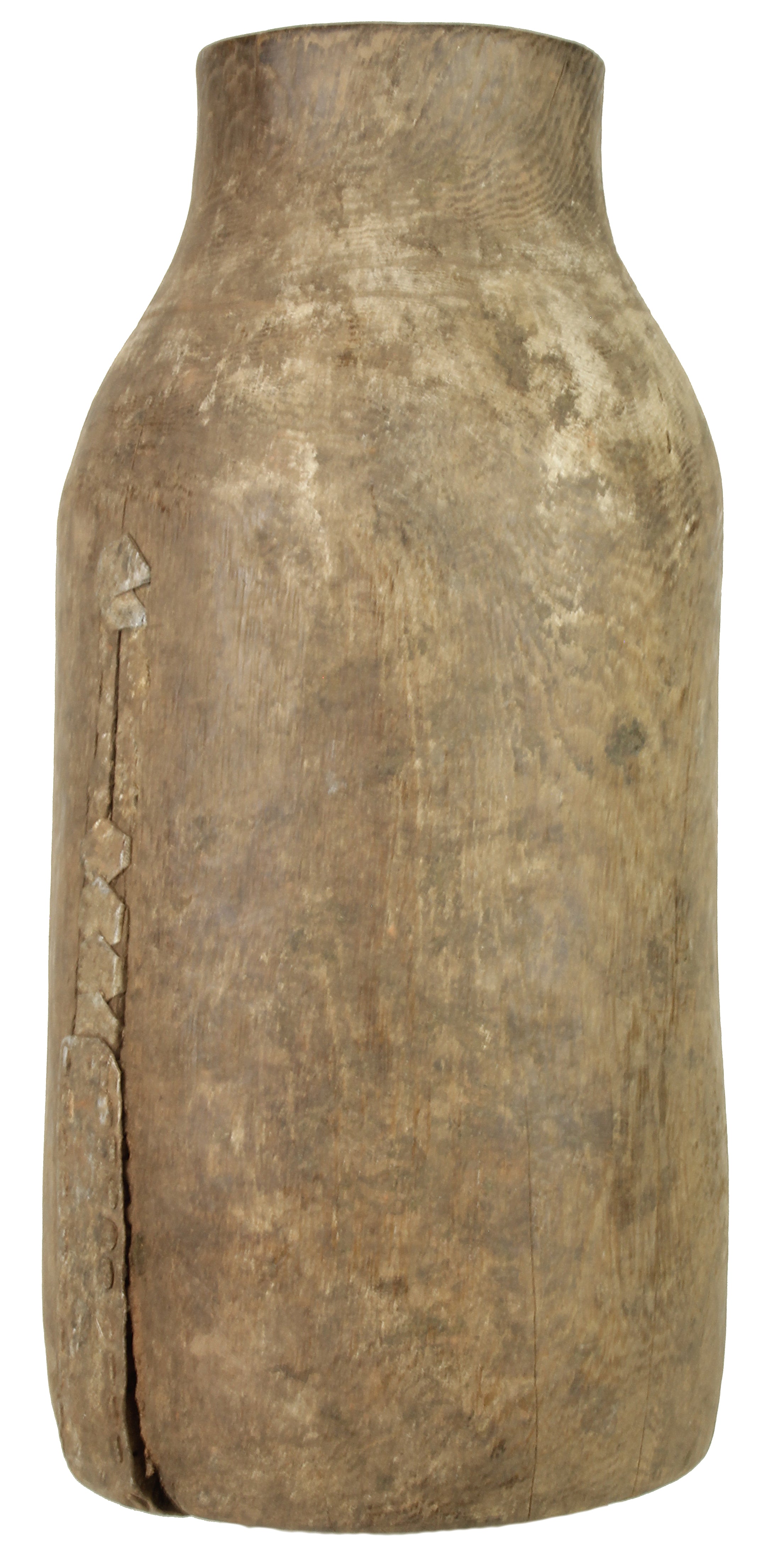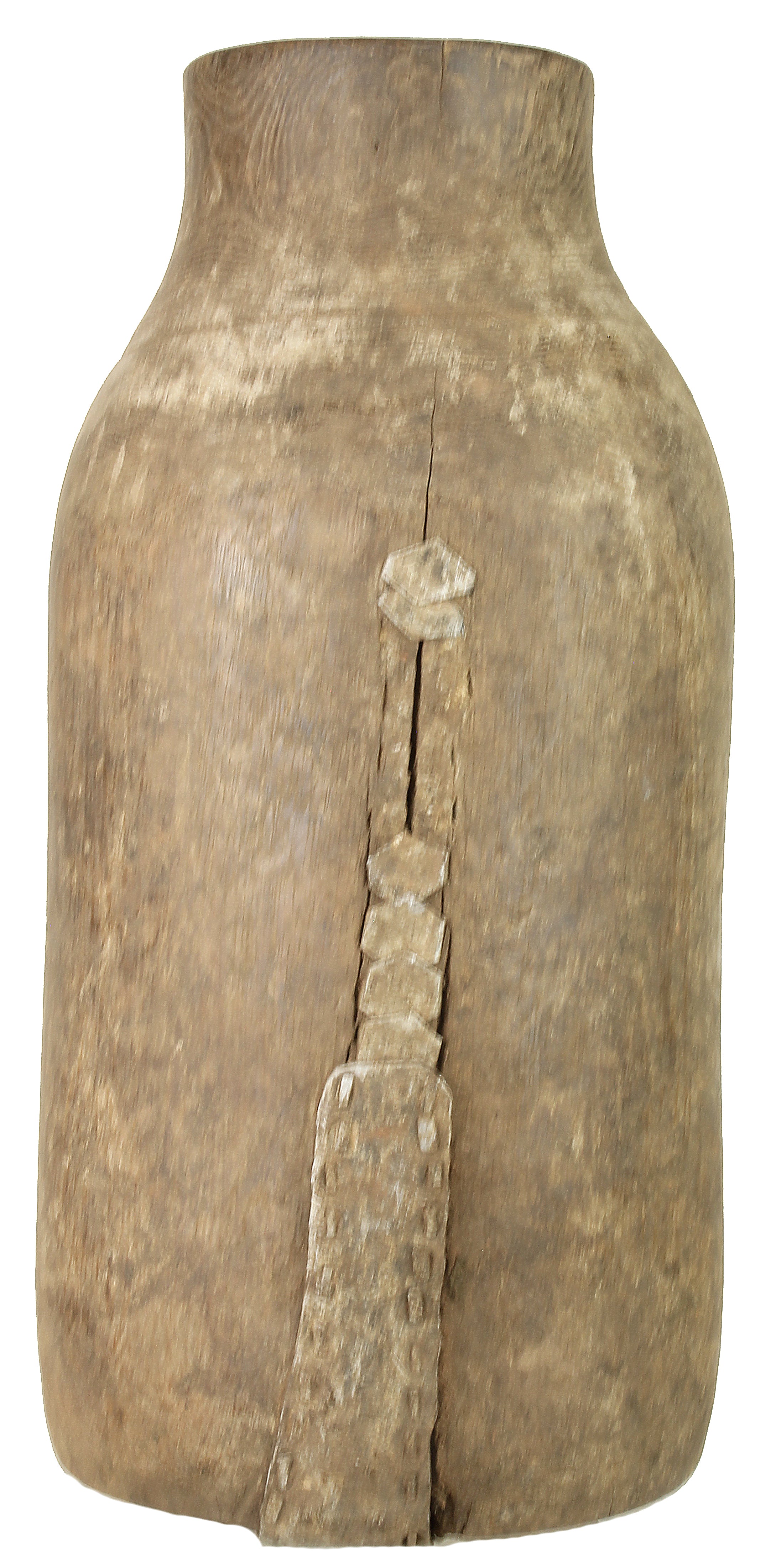 This is an old Hima (or Hema) container vase from Uganda. This beautiful Hima vessel was primarily used for storing liquids, which were most commonly milk. Making an object such as this is extremely time consuming, not only to get the symmetry and shape right, but primarily the length of time it takes to hollow out the center. Since this is an old object the use of power tools was not an option. Because of this, as the wood ages and dries, thus separating, it was more efficient to repair the separation with methods of repousse. Which is why this object has so many repairs in it. Luckily for our purposes this repairing bring amazing character and uniqueness. The container glistens in the light due to natural patina which almost shines the object with a protective layer. A perfect one of a kind decor object that will stand out in any modern room.This container measures 14″ x 6.5″