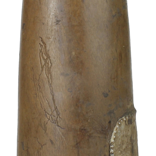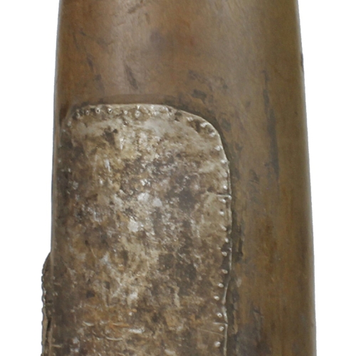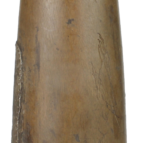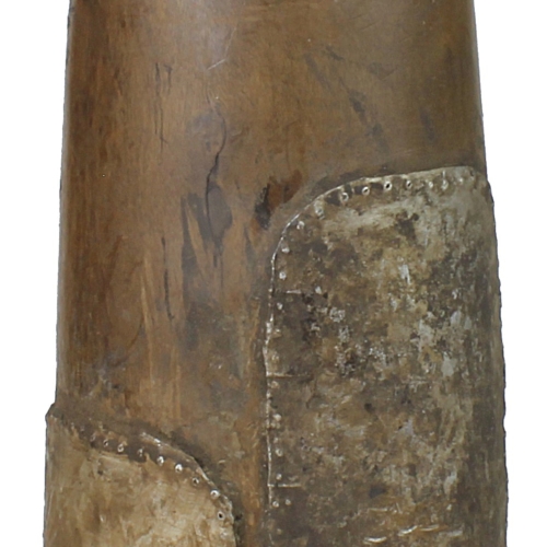 This is an old Hima (or Hema) container vase from Uganda. This beautiful Hima vessel was primarily used for storing liquids, which were most commonly milk. Making an object such as this is extremely time consuming, not only to get the symmetry and shape right, but primarily the length of time it takes to hollow out the center. Since this is an old object the use of power tools was not an option. Because of this, as the wood ages and dries, thus separating, it was more efficient to repair the separation with methods of repousse. Which is why this object has so many repairs in it. Luckily for our purposes this repairing bring amazing character and uniqueness. The container glistens in the light due to natural patina which almost shines the object with a protective layer. Towards the bottom of the object there is evidence of wood decay from the vessel sitting on the ground. A perfect one of a kind decor object that will stand out in any modern room.This container measures 16″ x 5.5″ (14cm x 40cm)
