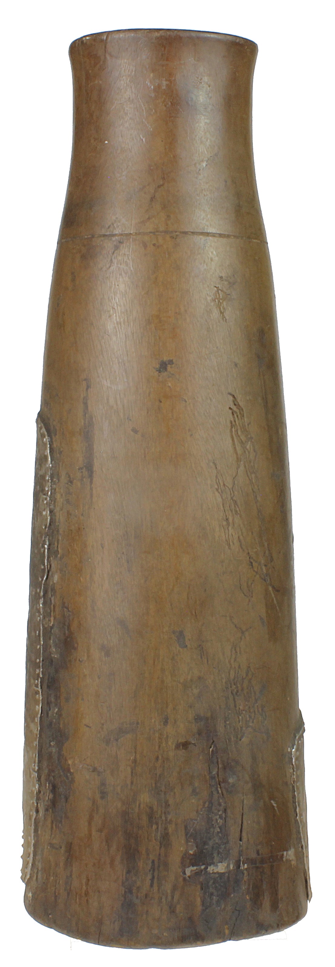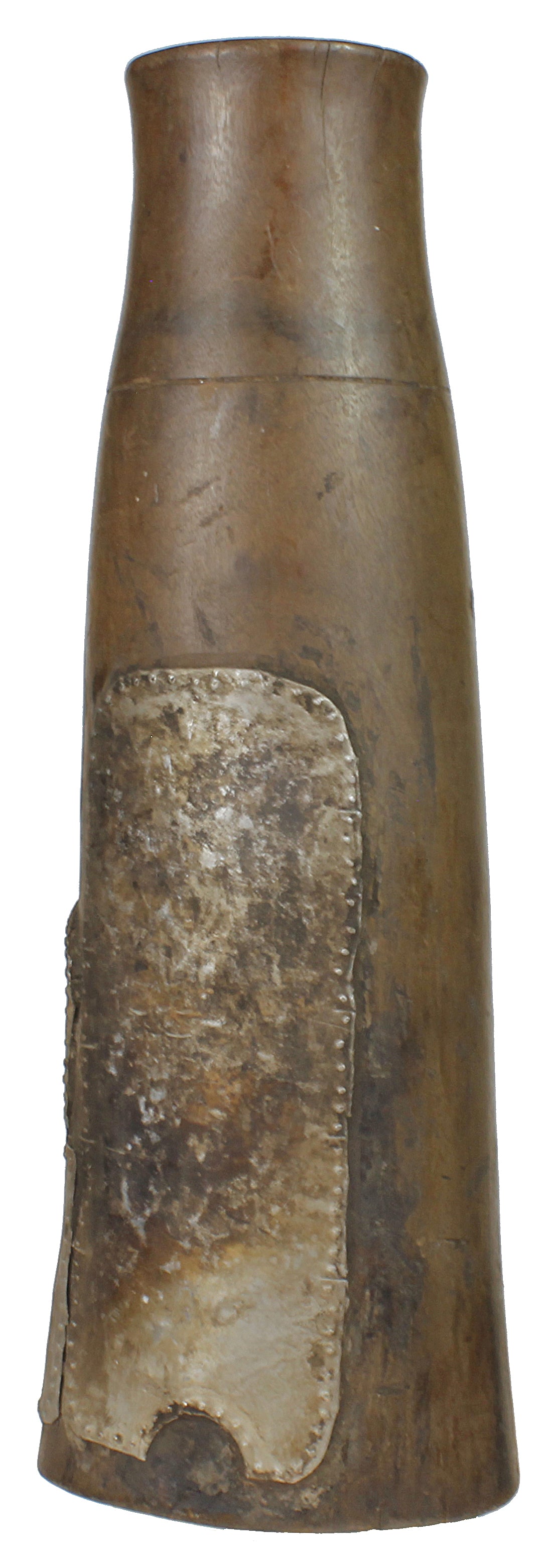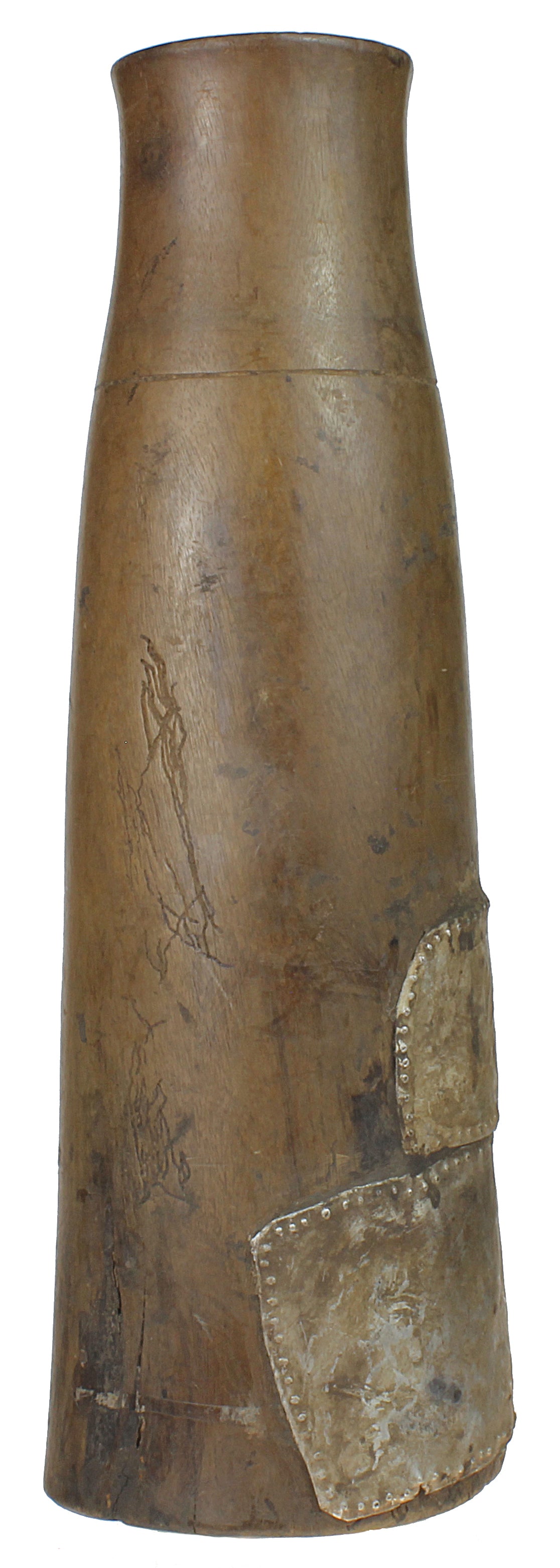 This is an old Hima (or Hema) container vase from Uganda. This beautiful Hima vessel was primarily used for storing liquids, which were most commonly milk. Making an object such as this is extremely time consuming, not only to get the symmetry and shape right, but primarily the length of time it takes to hollow out the center. Since this is an old object the use of power tools was not an option. Because of this, as the wood ages and dries, thus separating, it was more efficient to repair the separation with methods of repousse. Which is why this object has so many repairs in it. Luckily for our purposes this repairing bring amazing character and uniqueness. The container glistens in the light due to natural patina which almost shines the object with a protective layer. Towards the bottom of the object there is evidence of wood decay from the vessel sitting on the ground. A perfect one of a kind decor object that will stand out in any modern room.This container measures 16″ x 5.5″ (14cm x 40cm)