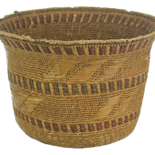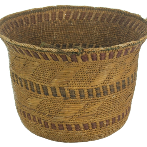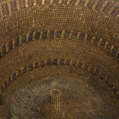 From Tanzania, East Africa, these baskets are used the same way all other similar baskets are used everywhere else in Africa. They are the primary vessel for storage and transportation of grain, fruit, vegetables and any other food item. Baskets of this type are often seen in markets containing food for sale there. The patina on the rims and side of this basket suggests it was handled often. There is residue of some sort on the interior surfaces which proves they were often in use in the way I have described. After 36 years of traveling in Africa and buying similar African items, we thought we had seen it all. These are truly amazing baskets, at least to us. This basket measures 15″ x 10.5″ (38cm x 26.75cm)
