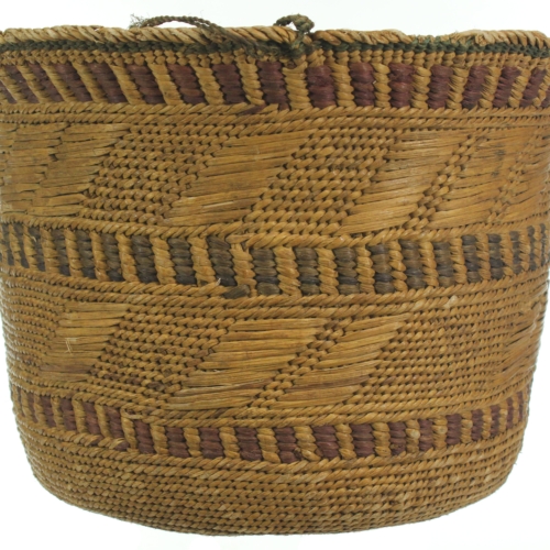 From Tanzania, East Africa, these baskets are used the same way all other similar baskets are used everywhere else in Africa. They are the primary vessel for storage and transportation of grain, fruit, vegetables and any other food item. Baskets of this type are often seen in markets containing food for sale there. The patina on the rims and side of this basket suggests it was handled often. There is residue of some sort on the interior surfaces which proves they were often in use in the way I have described. After 36 years of traveling in Africa and buying similar African items, we thought we had seen it all. These are truly amazing baskets, at least to us. This basket measures 15″ x 10.5″ (38cm x 26.75cm)