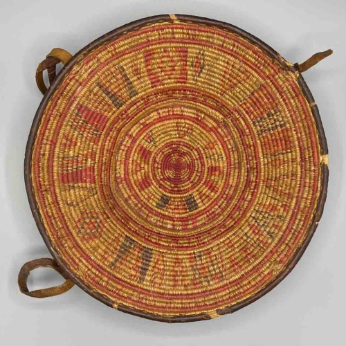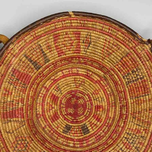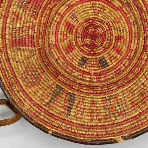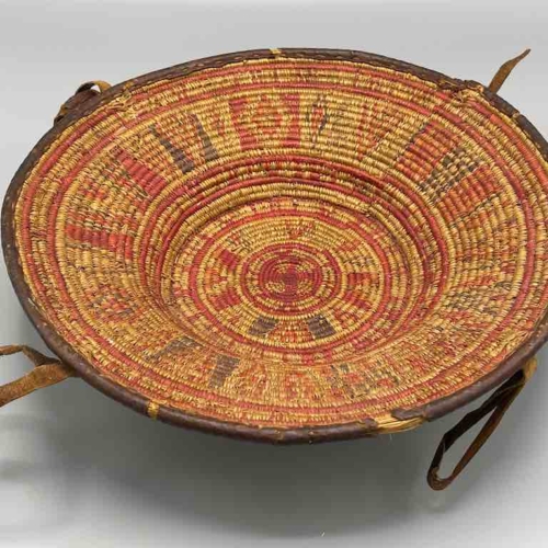 This very old, well-used, authentic basket was handmade of reeds in a single very narrow gauge coil and woven natural dyed grasses in detailed geometric designs. It has leather loop handles. Its rim is trimmed in leather as well as the rim of the footed base. Exceptional in design and technique these baskets are reflections of a family’s wealth. An Ethiopian bride could have kept her jewelry and other valuable objects in it with great pride. 13″ diameter x 3 1/2″ tall (33 x 9 cm)