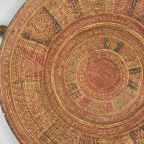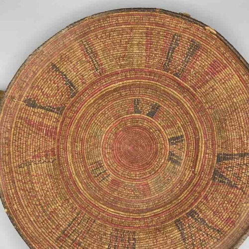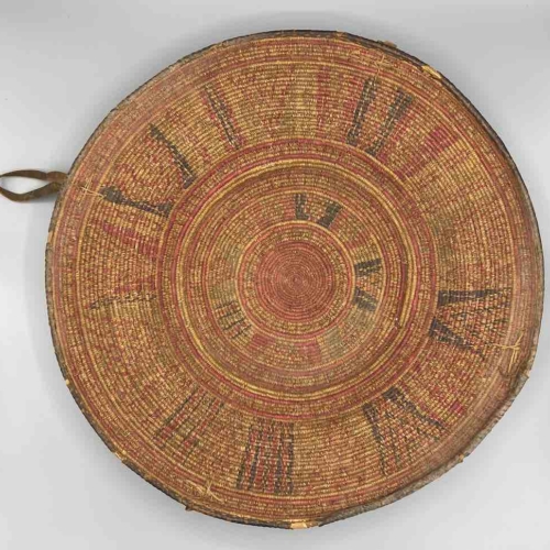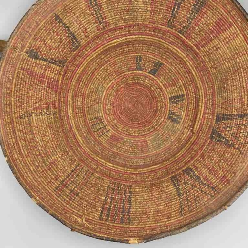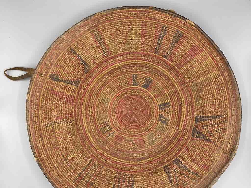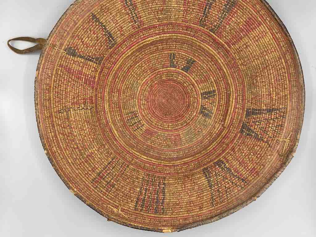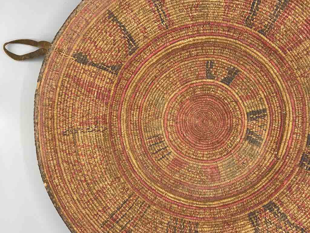 This very old, well-used, authentic basket was handmade of reeds in a single very narrow gauge coil and woven natural dyed grasses in detailed geometric designs. It has leather loop handles. Its rim is trimmed in leather as well as the rim of the footed base. Exceptional in design and technique these baskets are reflections of a family’s wealth. An Ethiopian bride could have kept her jewelry and other valuable objects in it with great pride. 18 3/4″ diameter x 3 1/2″ tall (48 x 9 cm)