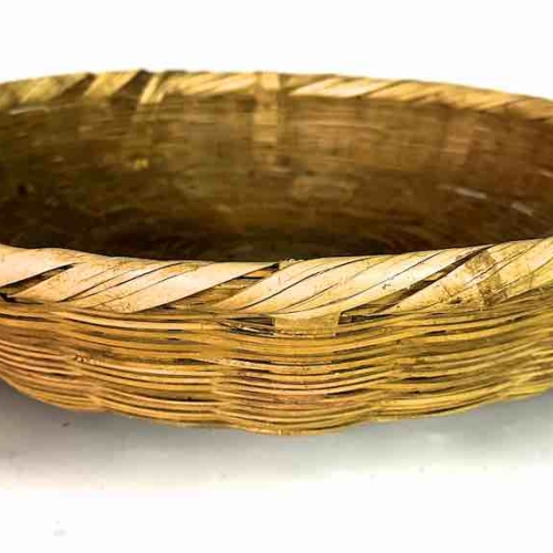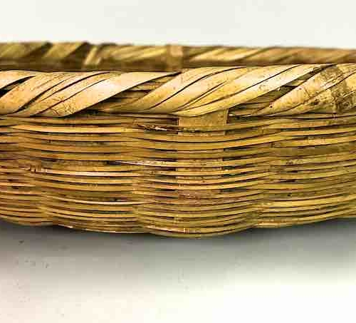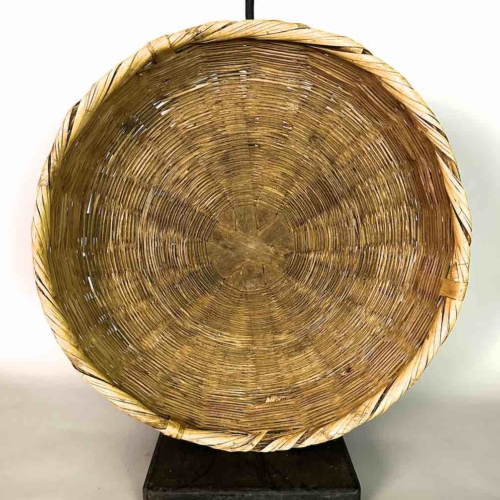 Since my wife is Salvadoran we spend a lot of time in El Salvador. We love that country. Of the many things that appeal to me are the oversize shallow baskets ambulatory merchants use to display the products they sell. They are handwoven of palm fronds in rural areas and are often seen attached to the front of a bicycle. This is a very old one, used for a long time. 5 3/4″ deep x 23″ in diameter (15 x 58 cm)