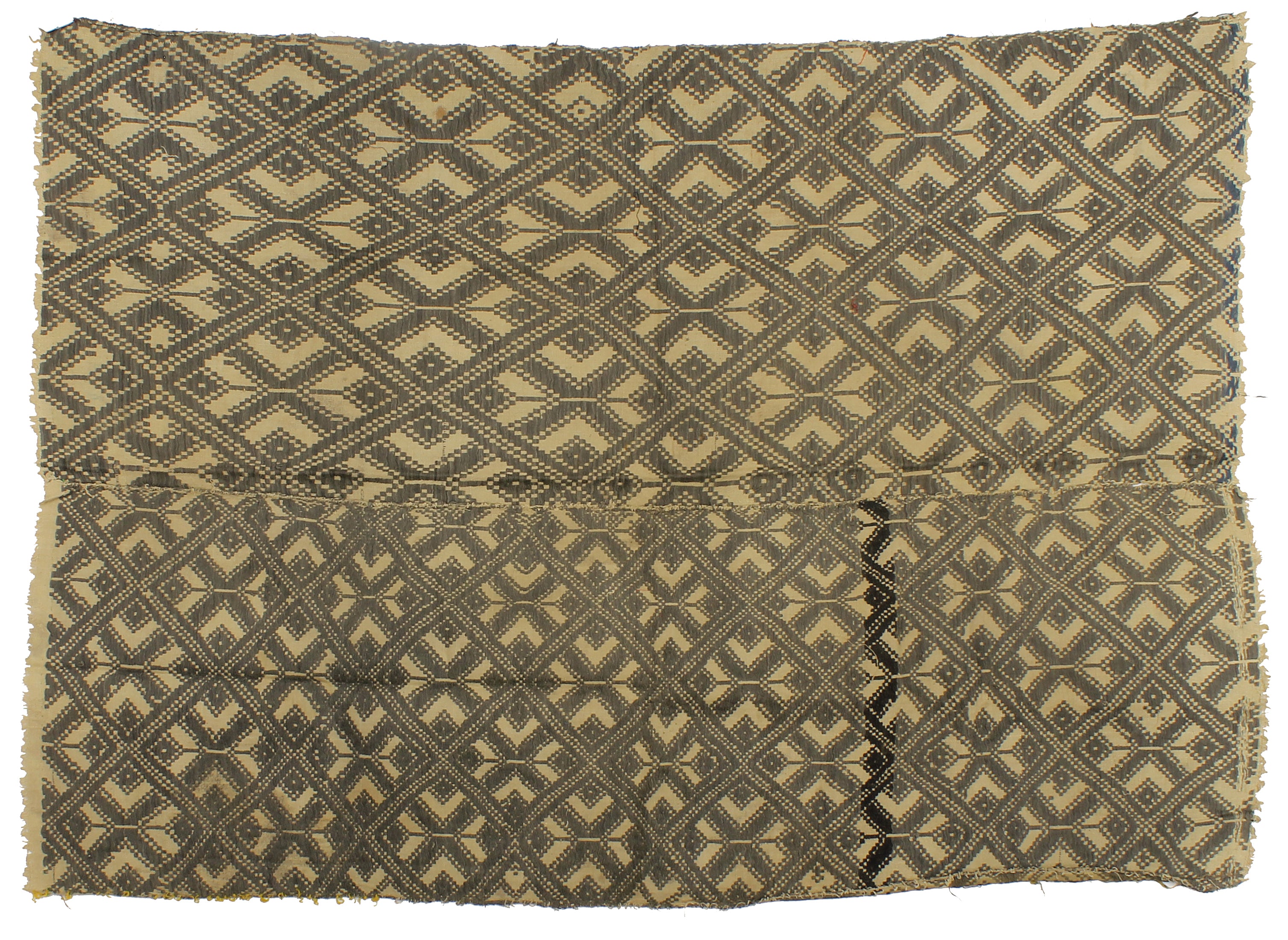 From the mountains of Northern Vietnam, resides the Muong ethnicity. Their signature handwoven blanket, used by the people for warmth during the rainy season of Vietnam. Where temperatures can get well below freezing. With a stunning central woven panel of natural indigo, black, and gray dyes consisting of two bands roughly 12″ each. Many blankets in their full form will have a boarder around the central panel to increase its size. Sometimes the boarder may be removed before selling, or replaced with a newer boarder when the previous gets old. The approximate age is over 40 years, which is sometimes quite evident by patches of fading color or repairs of different colored threads. This blanket measures 50″ x 34″