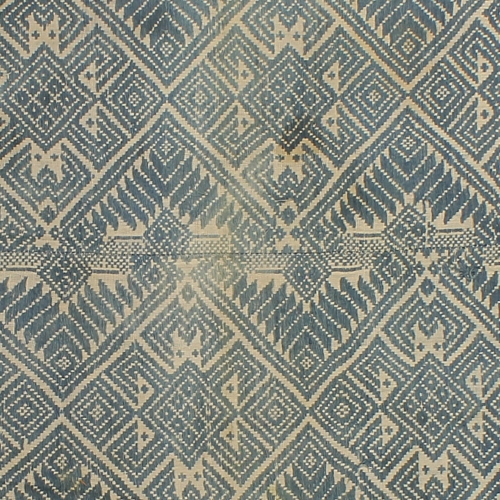 From the mountains of Northern Vietnam, resides the Muong ethnicity. Their signature handwoven blanket, used by the people for warmth during the rainy season of Vietnam. Where temperatures can get well below freezing. With a stunning central woven panel of natural indigo, black, and gray dyes consisting of two bands roughly 12″ each. Many blankets in their full form will have a boarder around the central panel to increase its size. Sometimes the boarder may be removed before selling, or replaced with a newer boarder when the previous gets old. The approximate age is over 40 years, which is sometimes quite evident by patches of fading color or repairs of different colored threads. This blanket measures 59″ x 34″