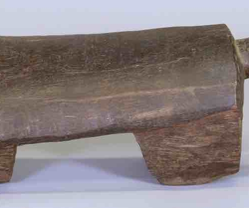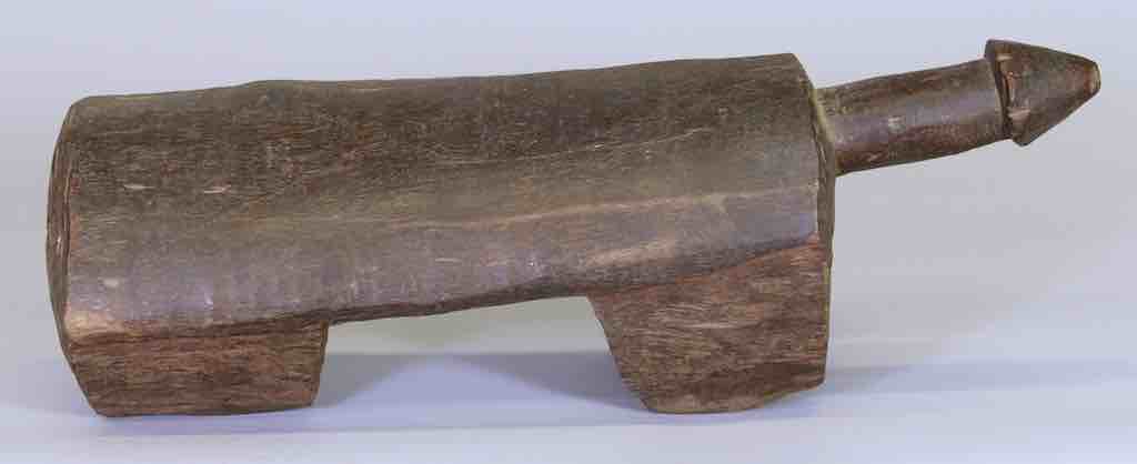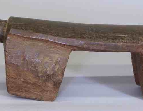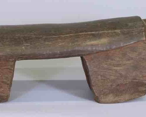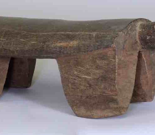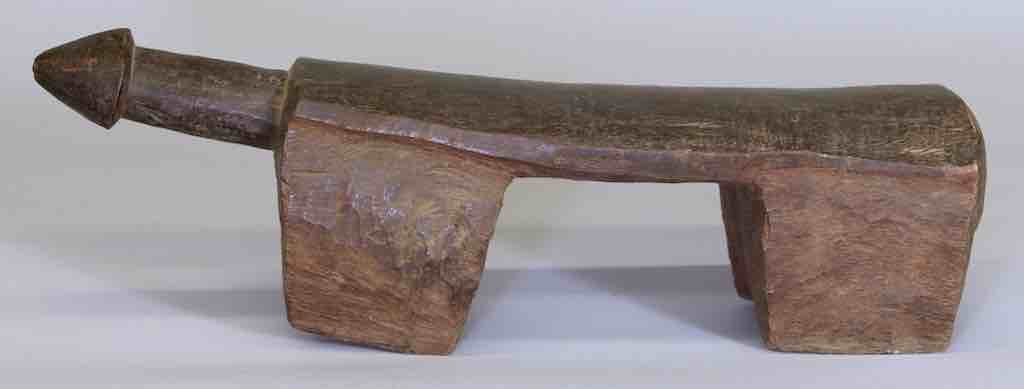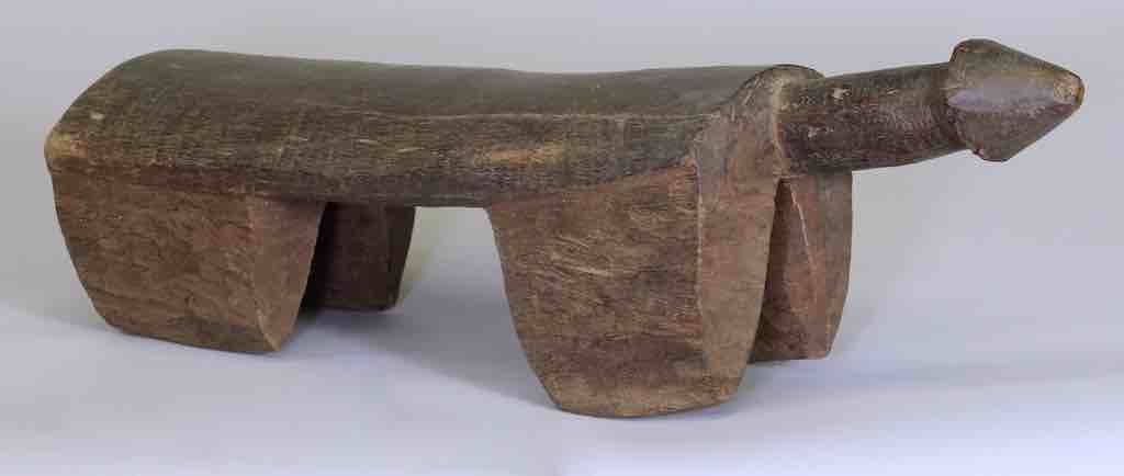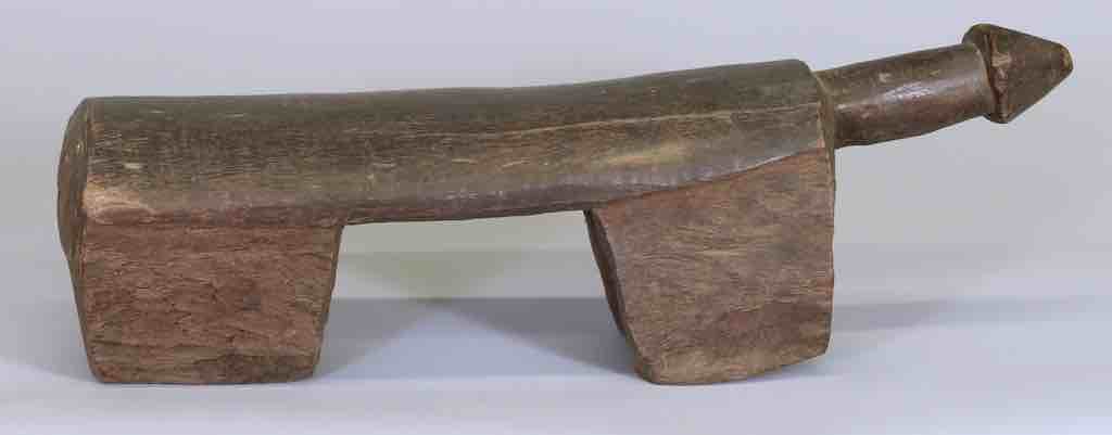 As it was told to me this stool is normally used by women. It stands out among African stools in that it is given to a woman by her husband when he travels to remind her of him and thereby guarantee her faithfulness. The representation is spiritual, not functional. This is an authentic, old, used stool. The wood of this stool is very heavy and dense; it is an extraordinary object. 17 x 5 1/4 x 4 1/4″ tall (43 x 13 x 11 cm)