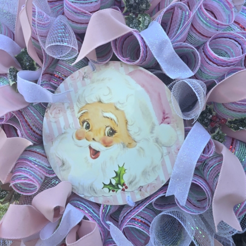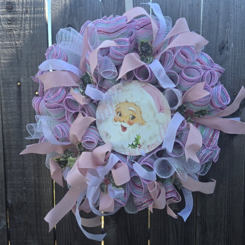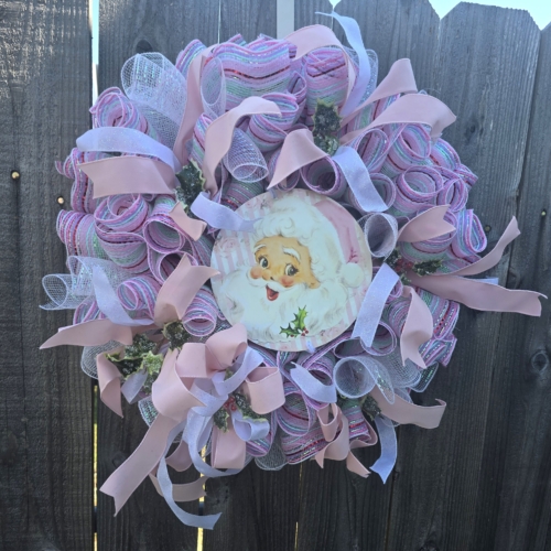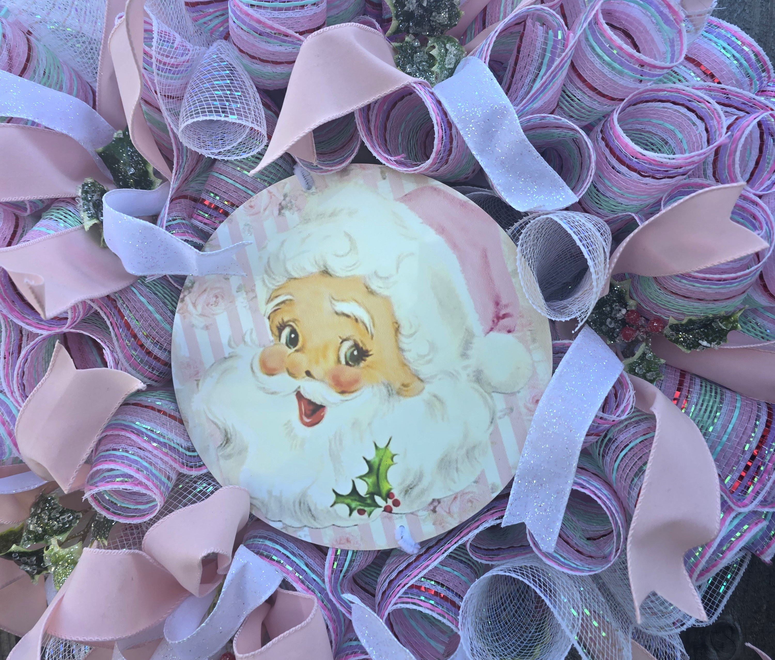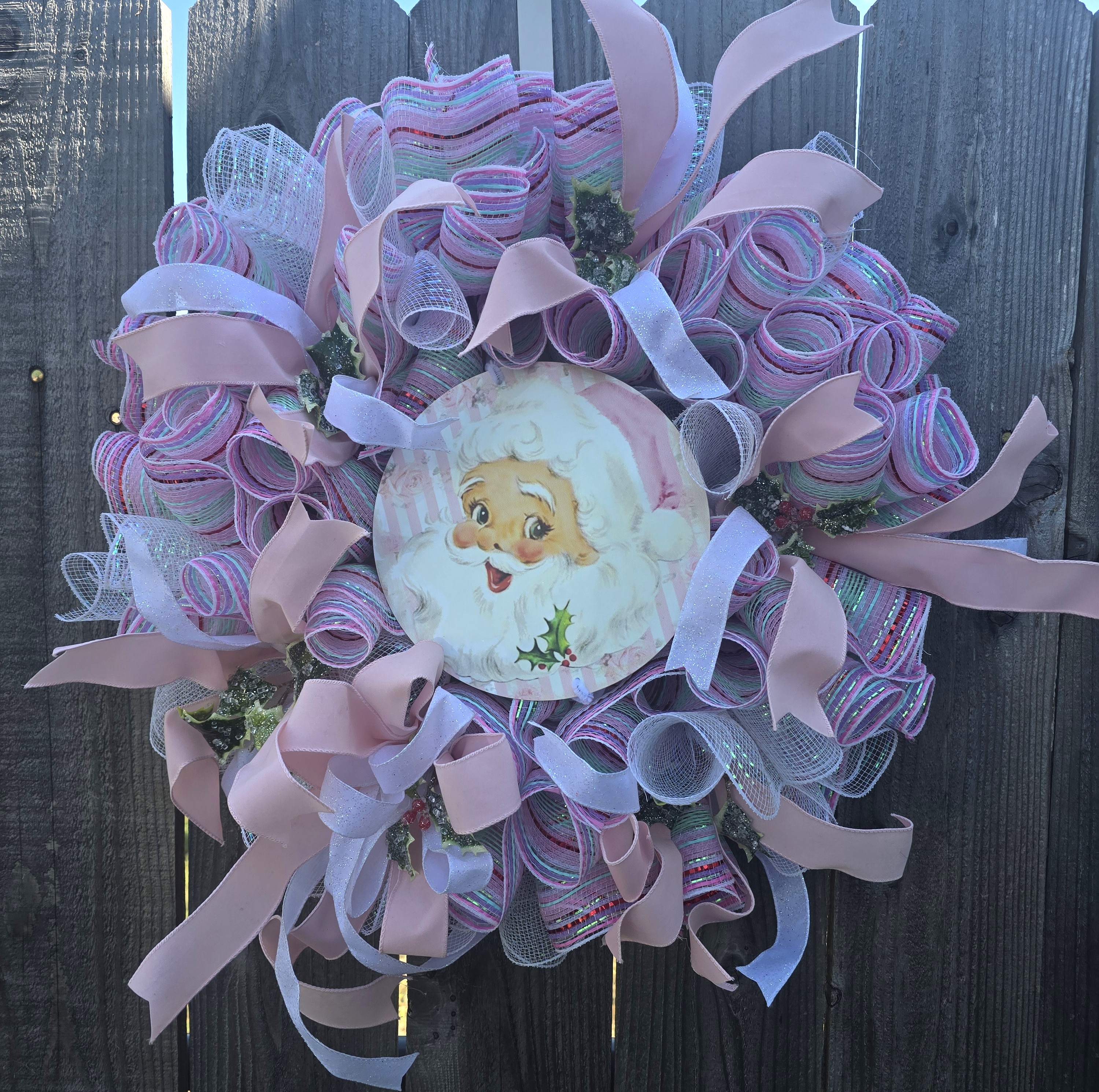 This cute as can be Pink Vintage Santa deco mesh wreath will greet your guests with a cheerful smile. Made with pastel thin stripe and white deco mesh, pink velvet ribbon and white sparkling ribbon throughout the wreath with a bow and faux holly and berries to match the Santa, this wreath measures approximately 24x24x6. The sign is white and pink stripe with a picture of a vintage Santa. Each wreath is individually handmade and made to order.