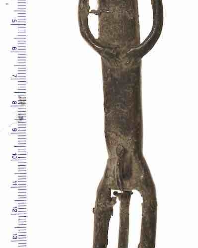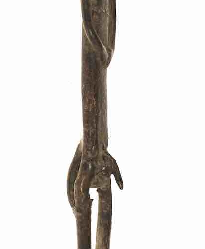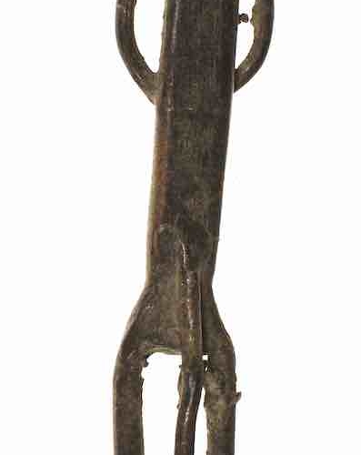 This very old explicit male figure with no head and a long tail is among the most extraordinary objects of African art I have ever seen. The technique of manufacture is very typical of the Dogon people employing the lost wax brass casting technique typical among many African peoples. I regret that I am unfamiliar with the iconography of the Dogon but in my over 40 years of experience collecting African art I have seen numerous examples of modifications to common forms. This one, however, is the only one even close to this that I have ever seen. The object is very well worn, suggesting that it was in use for many years after the head was lost, if it ever existed. It measures:6 3/4 x 1 3/8 x 7/8″ (17 x 3.5 x 2.2 cm)