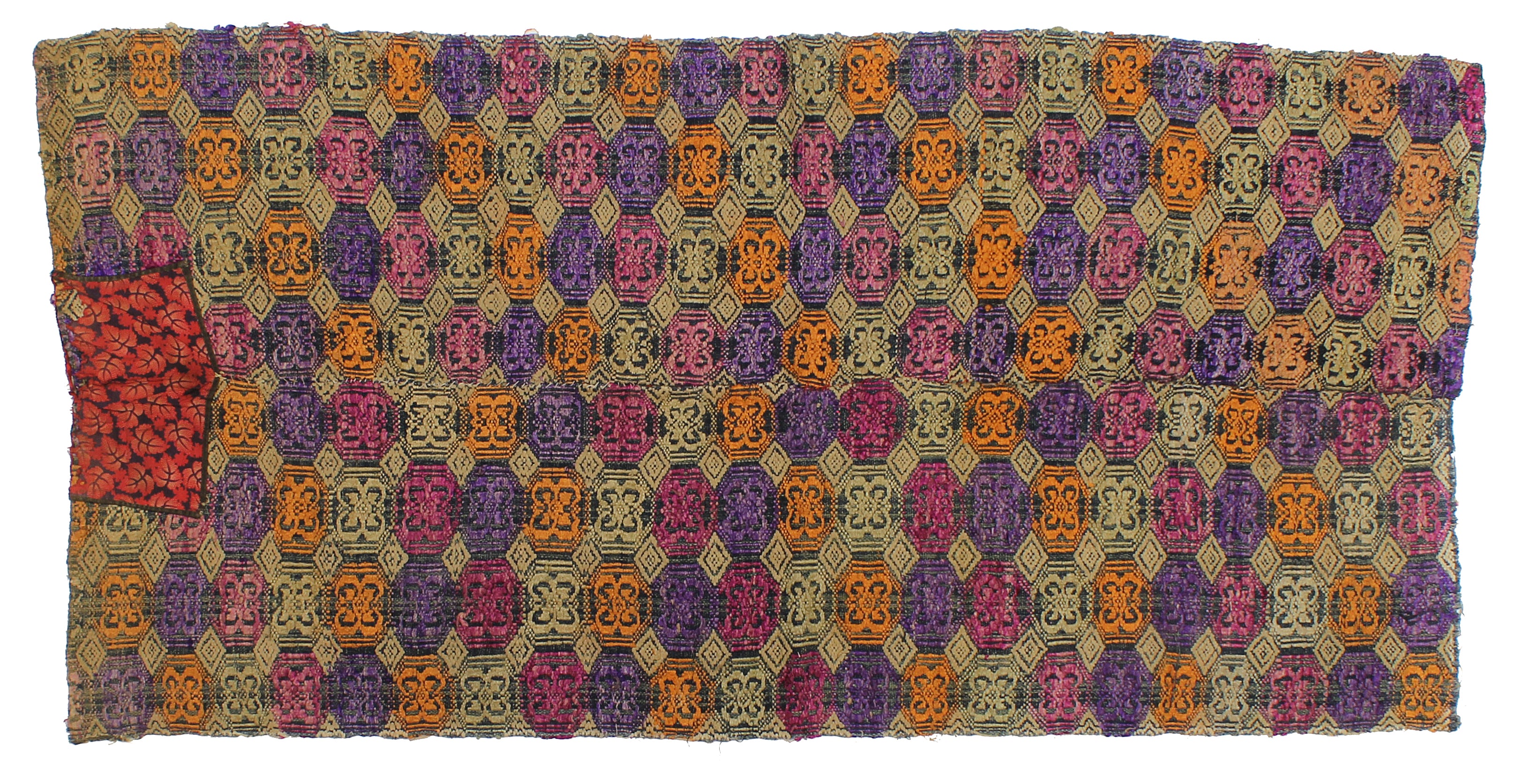 From the mountains of Northern Vietnam, resides the Tay ethnicity. Some may refer to them as “White Tay”. The people of this ethnicity are typically known for their technical embroidery and handwoven blankets, used by the people for warmth during the rainy season of Vietnam. Where temperatures can get well below freezing. Their textiles can be most commonly recognized by their diverse range of colors from dyes that they produce from surrounding plants and trees in the environment. A few examples are betel, mango, and coffee leaves. What makes this quilt so impressive is that the textile is woven from silk. A single cocoon of silk from the silk worm will create a thread roughly 2000 feet long. However, it takes over 4,000 cocoons to create a single pound of silk. The silk worm is only alive for roughly 1 week before it begins its transformation into a moth. Silk worms are only active from the late spring to early fall months due to their intolerance to heat and cold. Thus it is an outstanding effort on behalf of the community to create such a wonderful textile. This textile features a stunning central woven panel consisting of two bands roughly 13″ each. Many blankets in their full form will have a boarder around the central panel to increase its size. Sometimes the boarder may be removed before selling, or replaced with a newer boarder when the previous gets old. The approximate age is over 50 years. This quilt measures 53″ x 12.5″