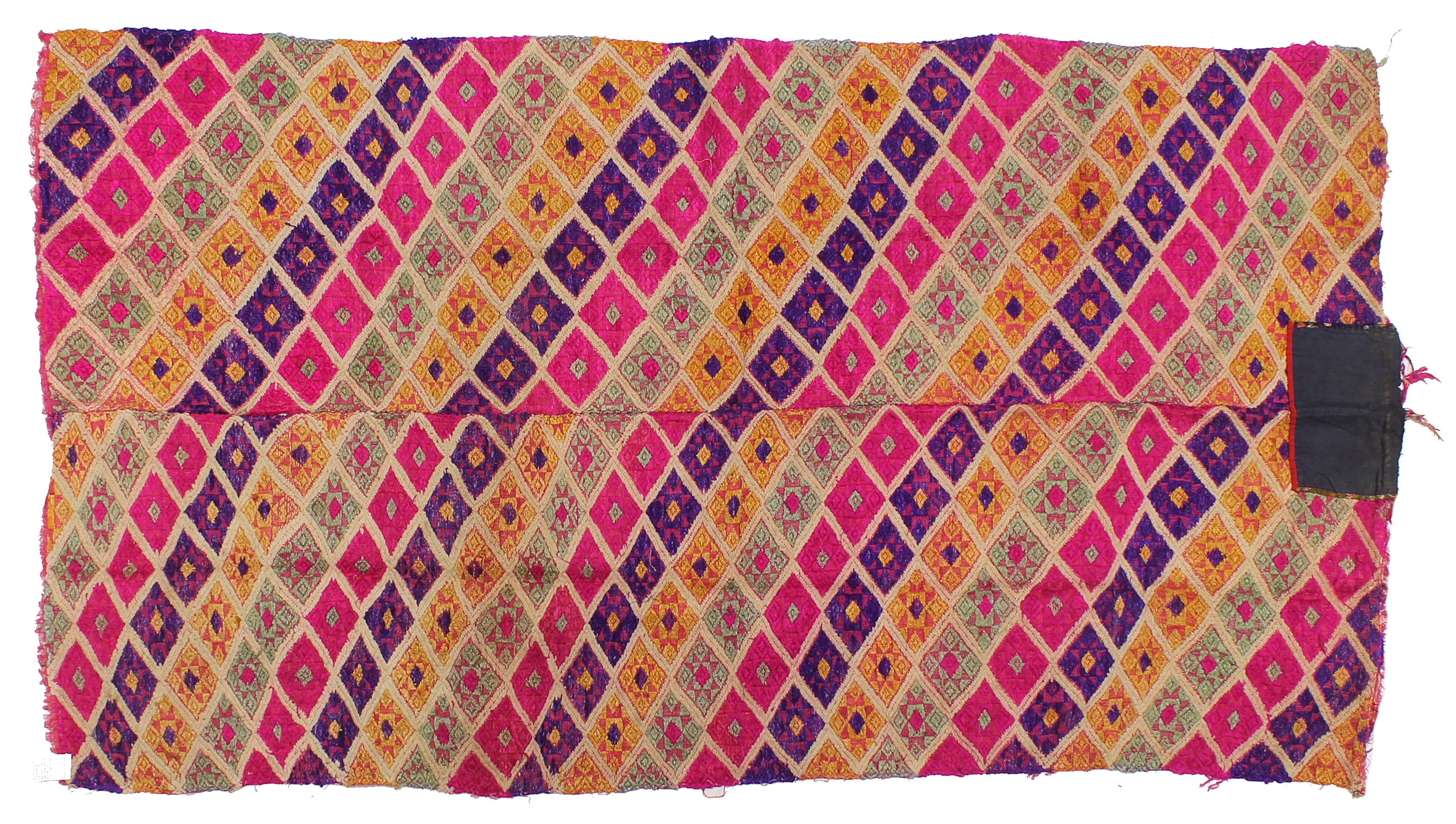 From the mountains of Northern Vietnam, resides the Tay ethnicity. Some may refer to them as “White Tay”. The people of this ethnicity are typically known for their technical embroidery and handwoven blankets, used by the people for warmth during the rainy season of Vietnam. Where temperatures can get well below freezing. Their textiles can be most commonly recognized by their diverse range of colors from dyes that they produce from surrounding plants and trees in the environment. A few examples are betel, mango, and coffee leaves. What makes this quilt so impressive is that the textile is woven from silk. A single cocoon of silk from the silk worm will create a thread roughly 2000 feet long. However, it takes over 4,000 cocoons to create a single pound of silk. The silk worm is only alive for roughly 1 week before it begins its transformation into a moth. Silk worms are only active from the late spring to early fall months due to their intolerance to heat and cold. Thus it is an outstanding effort on behalf of the community to create such a wonderful textile. This textile features a stunning central woven panel consisting of two bands roughly 13″ each. Many blankets in their full form will have a boarder around the central panel to increase its size. Sometimes the boarder may be removed before selling, or replaced with a newer boarder when the previous gets old. The approximate age is over 50 years. This quilt measures 53″ x 29″