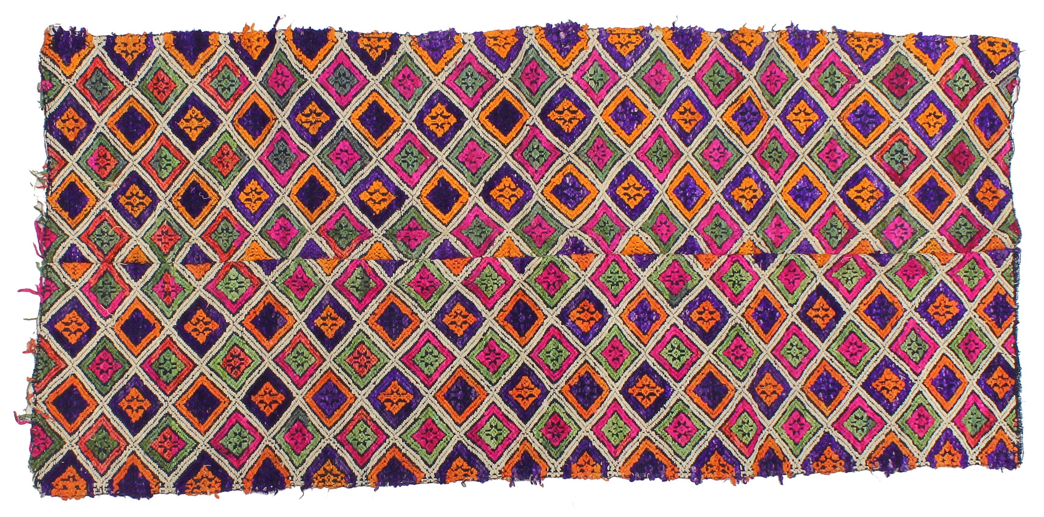 From the mountains of Northern Vietnam, resides the Tay ethnicity. Some may refer to them as “White Tay”. The people of this ethnicity are typically known for their technical embroidery and handwoven blankets, used by the people for warmth during the rainy season of Vietnam. Where temperatures can get well below freezing. Their textiles can be most commonly recognized by their diverse range of colors from dyes that they produce from surrounding plants and trees in the environment. A few examples are betel, mango, and coffee leaves. What makes this quilt so impressive is that the textile is woven from silk. A single cocoon of silk from the silk worm will create a thread roughly 2000 feet long. However, it takes over 4,000 cocoons to create a single pound of silk. The silk worm is only alive for roughly 1 week before it begins its transformation into a moth. Silk worms are only active from the late spring to early fall months due to their intolerance to heat and cold. Thus it is an outstanding effort on behalf of the community to create such a wonderful textile. This textile features a stunning central woven panel consisting of two bands roughly 13″ each. Many blankets in their full form will have a boarder around the central panel to increase its size. Sometimes the boarder may be removed before selling, or replaced with a newer boarder when the previous gets old. The approximate age is over 50 years. This quilt measures 56″ x 25″