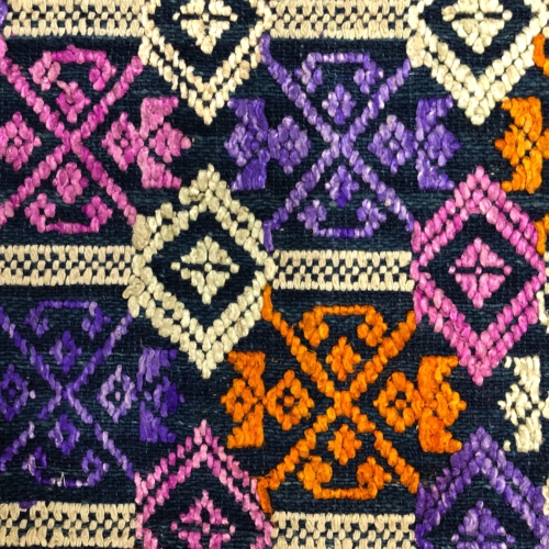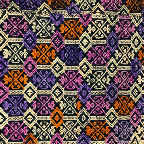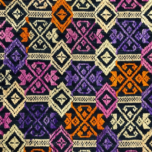 From the mountains of Northern Vietnam, resides the Tay ethnicity. Some may refer to them as “White Tay”. The people of this ethnicity are typically known for their technical embroidery and handwoven blankets, used by the people for warmth during the rainy season of Vietnam. Where temperatures can get well below freezing. Their textiles can be most commonly recognized by their diverse range of colors from dyes that they produce from surrounding plants and trees in the environment. A few examples are betel, mango, and coffee leaves. What makes this quilt so impressive is that the textile is woven from silk. A single cocoon of silk from the silk worm will create a thread roughly 2000 feet long. However, it takes over 4,000 cocoons to create a single pound of silk. The silk worm is only alive for roughly 1 week before it begins its transformation into a moth. Silk worms are only active from the late spring to early fall months due to their intolerance to heat and cold. Thus it is an outstanding effort on behalf of the community to create such a wonderful textile. This textile features a stunning central woven panel consisting of two bands roughly 13″ each. Many blankets in their full form will have a boarder around the central panel to increase its size. Sometimes the boarder may be removed before selling, or replaced with a newer boarder when the previous gets old. The approximate age is over 50 years. This quilt measures 66″ x 47″ (168cm x 119cm). Interior dimensions measure 55″ x 27″ (138cm x 68cm)