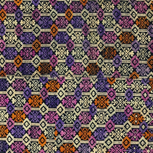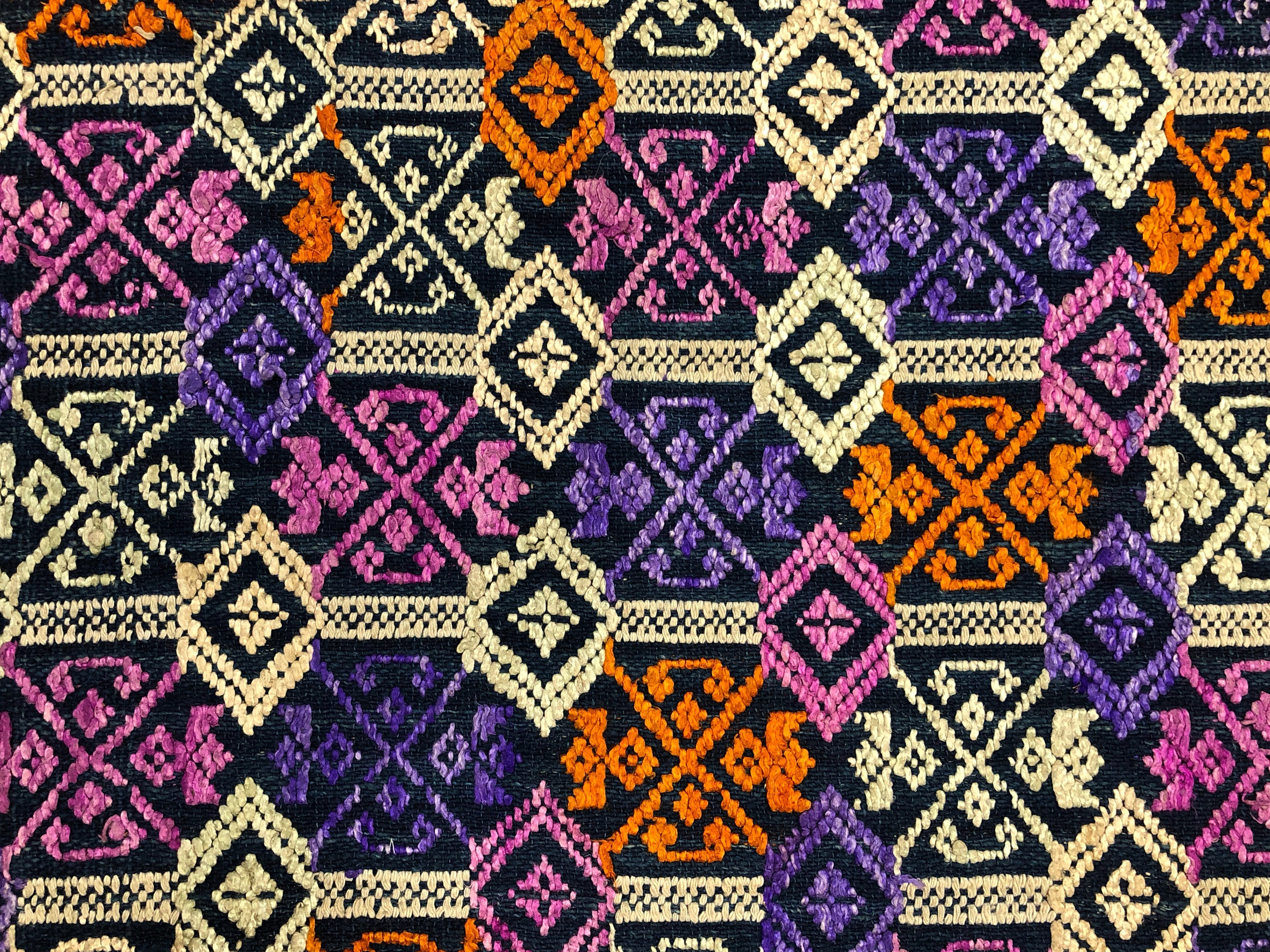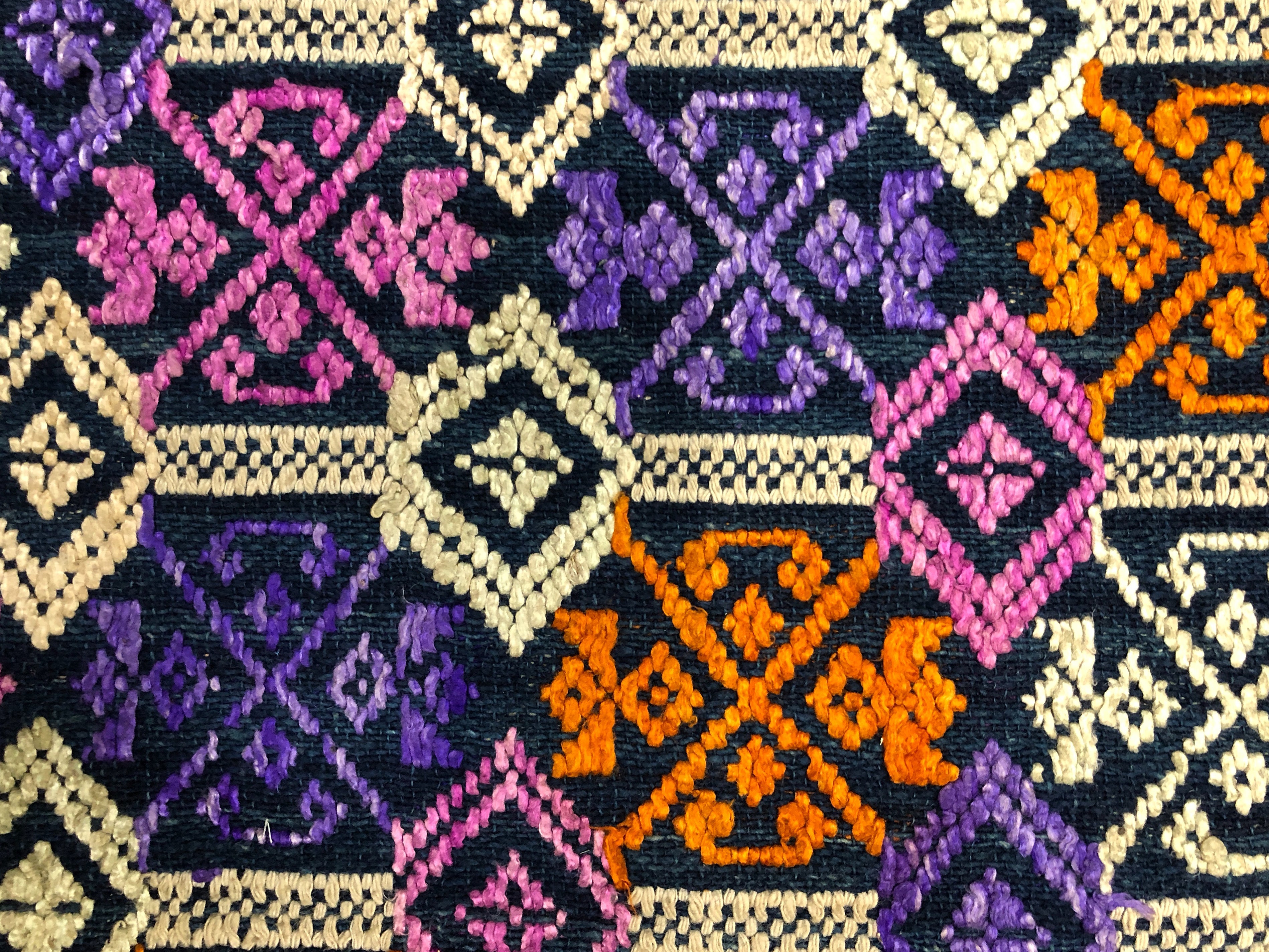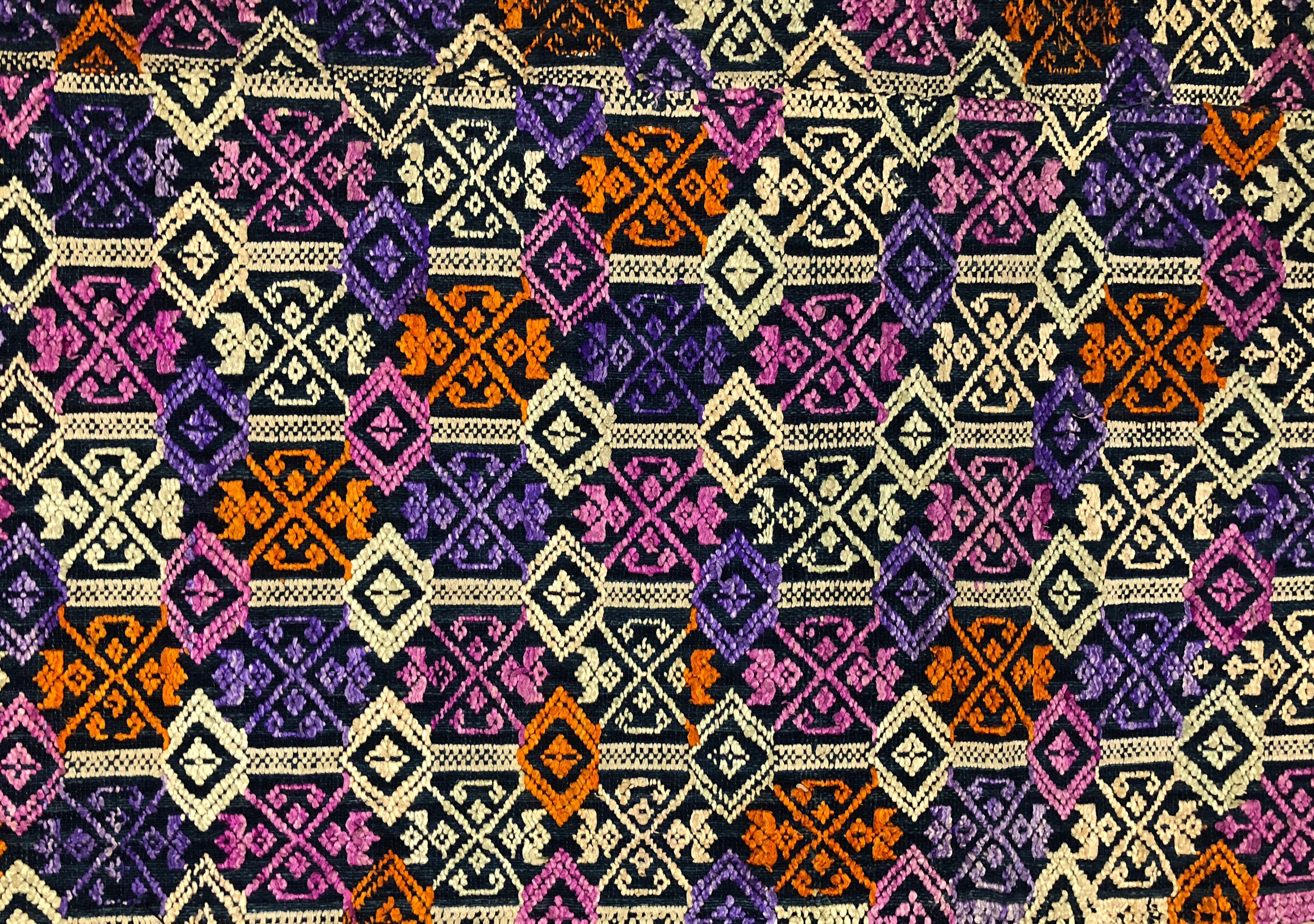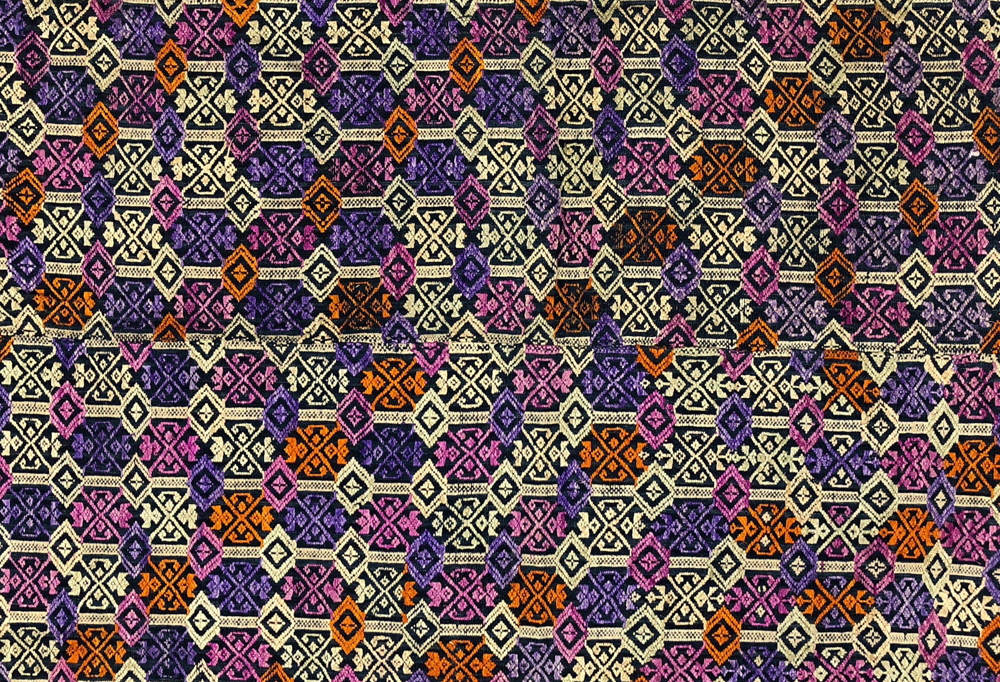 From the mountains of Northern Vietnam, resides the Tay ethnicity. Some may refer to them as “White Tay”. The people of this ethnicity are typically known for their technical embroidery and handwoven blankets, used by the people for warmth during the rainy season of Vietnam. Where temperatures can get well below freezing. Their textiles can be most commonly recognized by their diverse range of colors from dyes that they produce from surrounding plants and trees in the environment. A few examples are betel, mango, and coffee leaves. What makes this quilt so impressive is that the textile is woven from silk. A single cocoon of silk from the silk worm will create a thread roughly 2000 feet long. However, it takes over 4,000 cocoons to create a single pound of silk. The silk worm is only alive for roughly 1 week before it begins its transformation into a moth. Silk worms are only active from the late spring to early fall months due to their intolerance to heat and cold. Thus it is an outstanding effort on behalf of the community to create such a wonderful textile. This textile features a stunning central woven panel consisting of two bands roughly 13″ each. Many blankets in their full form will have a boarder around the central panel to increase its size. Sometimes the boarder may be removed before selling, or replaced with a newer boarder when the previous gets old. The approximate age is over 50 years. This quilt measures 66″ x 47″ (168cm x 119cm). Interior dimensions measure 55″ x 27″ (138cm x 68cm)